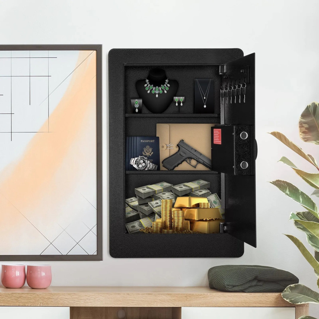 Ez a falba építhető, 3 polcos digitális széf diszkrét és biztonságos megoldást kínál hosszú fegyverek, útlevelek, ékszerek, készpénz és fontos dokumentumok tárolására. Vékony kialakítása lehetővé teszi, hogy akár falba süllyesztve vagy egy kép mögé rejtve is elhelyezhető legyen, így maximális védelmet és láthatatlanságot biztosít.