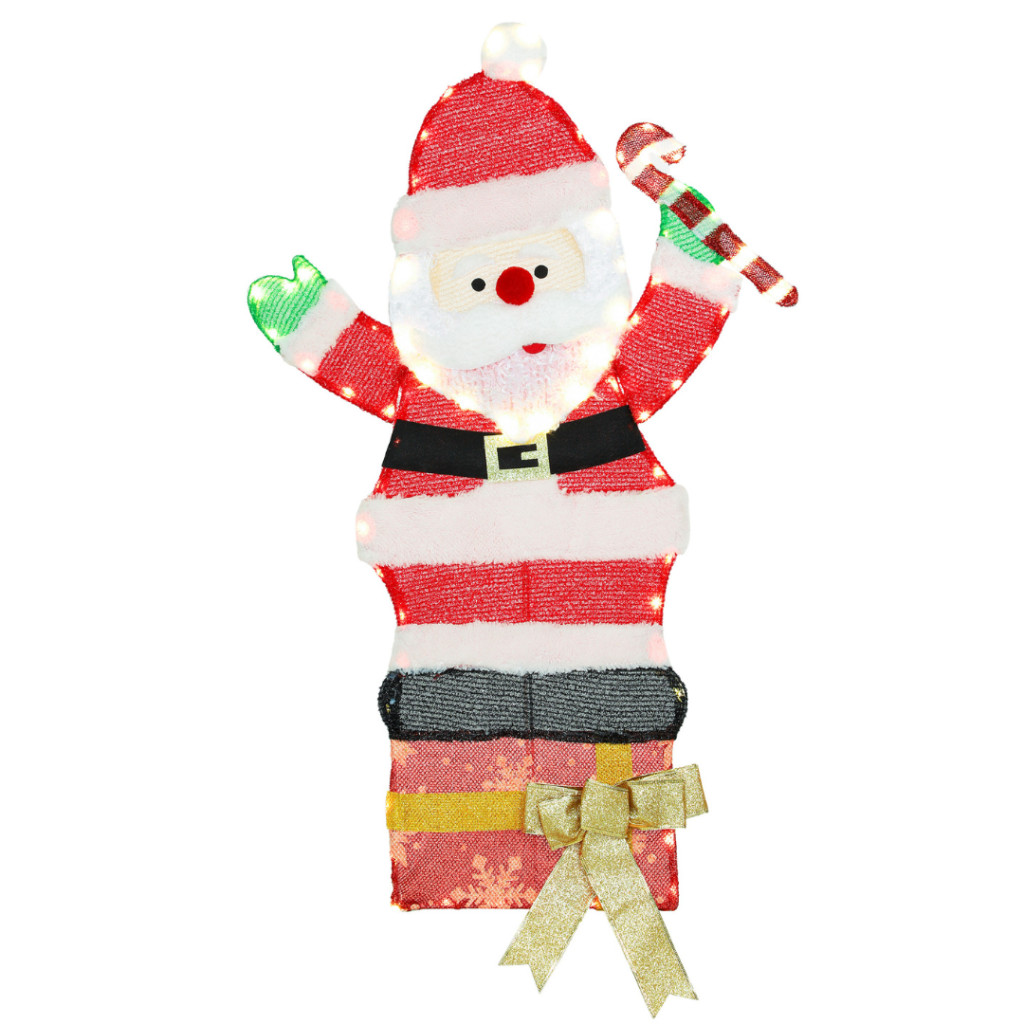 Ünnepelje a karácsony varázsát ezzel a 93 cm magas, világító Mikulás dekorációval, amely játékosan egy ajándékdoboz tetején állva köszönti vendégeit. A 97 darab melegfehér LED-fény életre kelti a téli esték hangulatát, miközben meghitt és látványos fényt varázsol kertjébe vagy nappalijába.