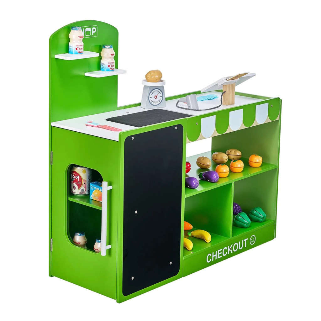 Gyerek játékbolt fa kivitelben 35 részes szupermarket játékszett pénztárral