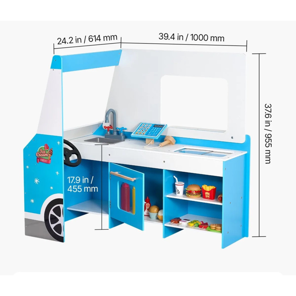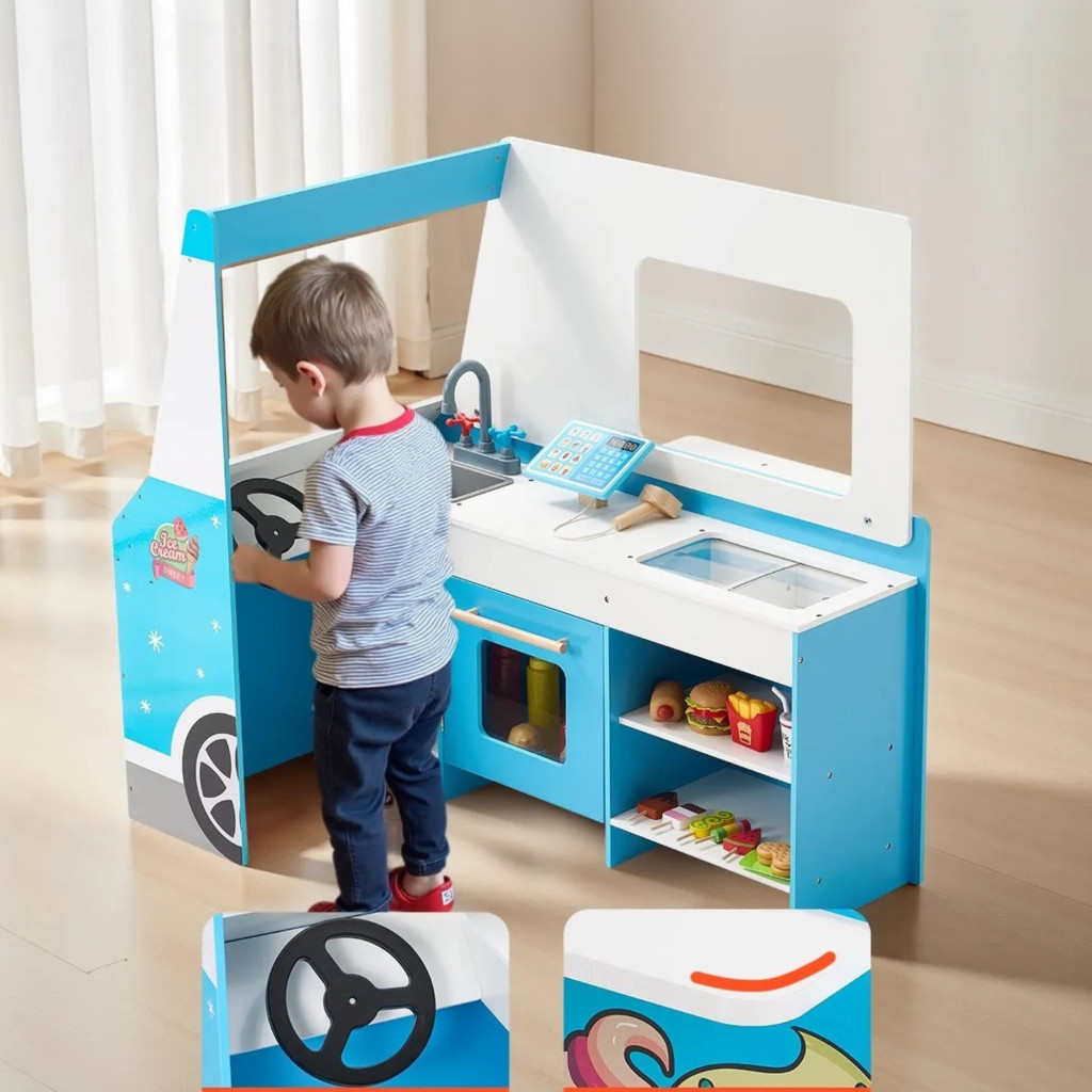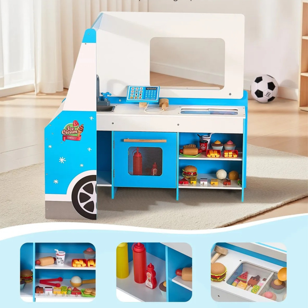 A gyermek szabadon kombinálhatja az elemeket, így minden játék alkalom egy új történet kezdete. A gyerek játék konyha fagylaltos kocsival valódi élményt nyújt.