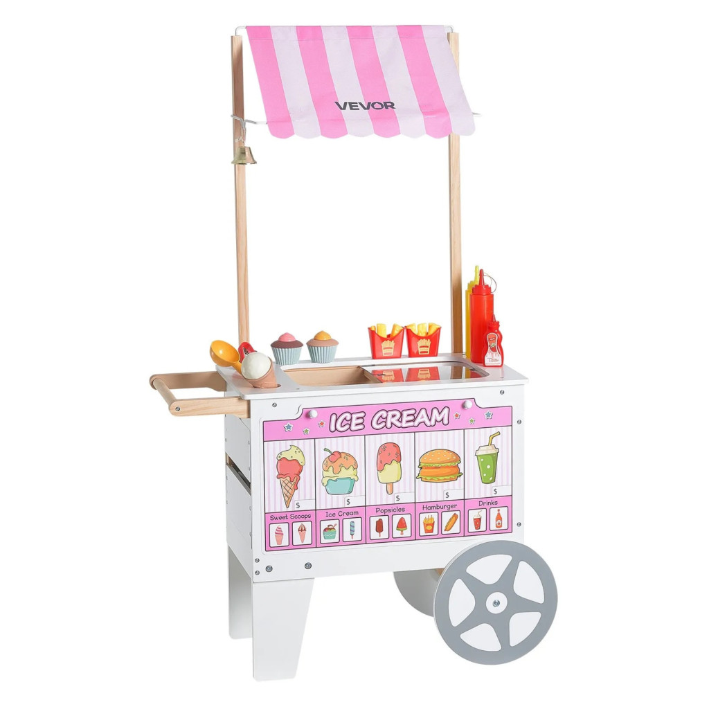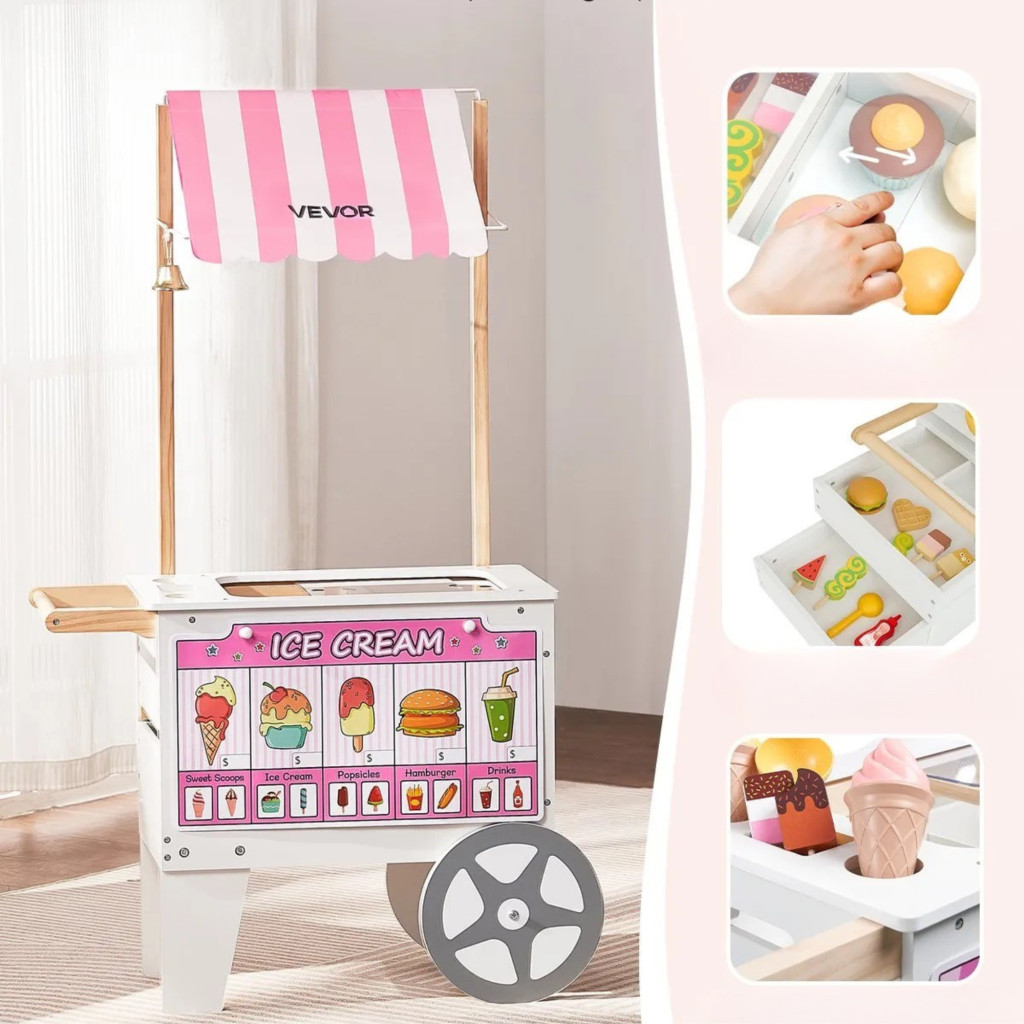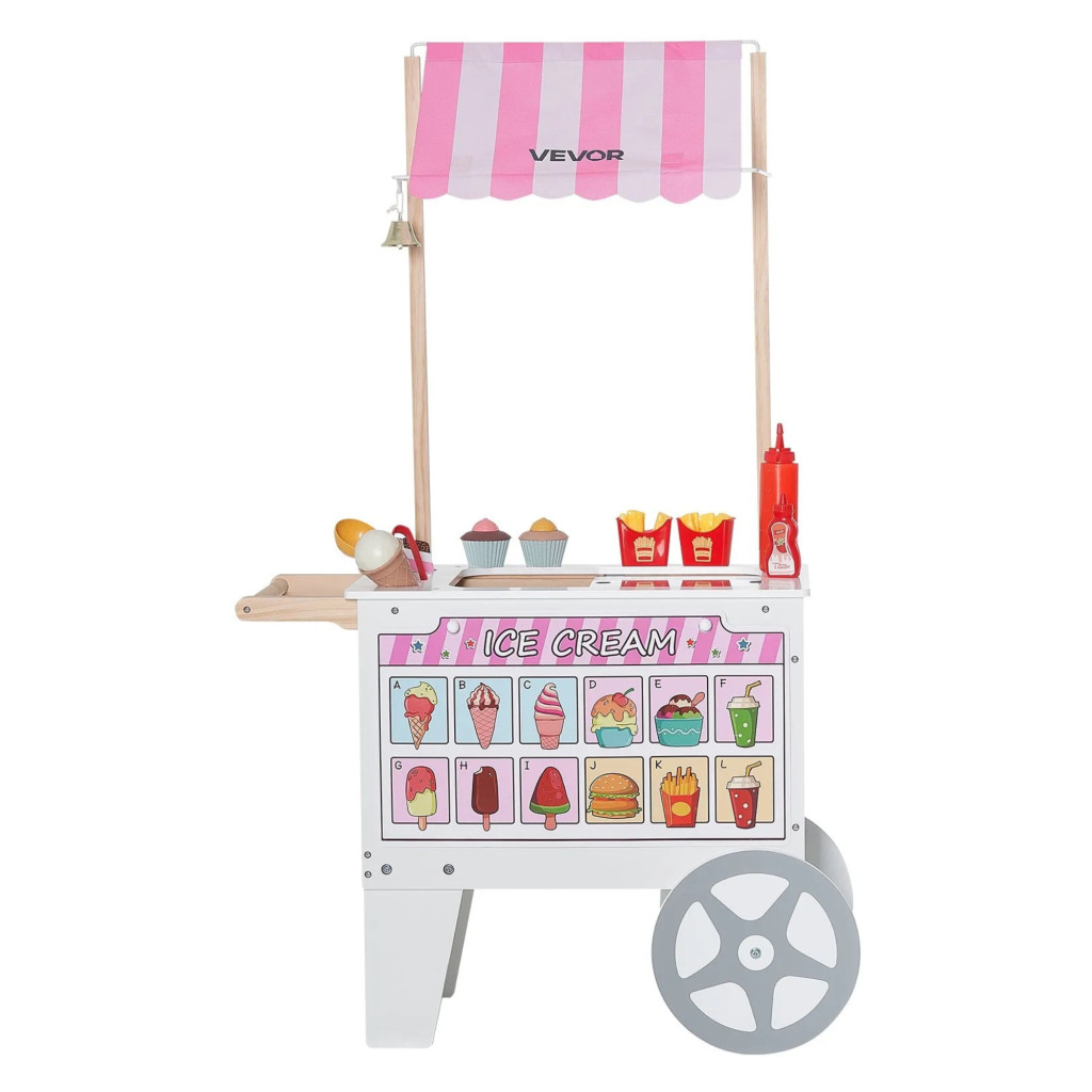 A fa fagylaltos játék kocsi lehetőséget ad arra, hogy gyermeke kipróbálja magát eladóként. Készíthet fagylaltot, hot dogot szolgálhat fel, és akár „vásárlókkal” is kommunikálhat játék közben.