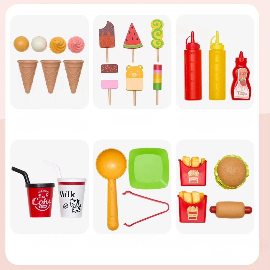 A gyermek szabadon kombinálhatja az elemeket, így minden játék alkalom új élményt nyújt. A gyerek játék konyha fagylaltos kocsival igazi élményt ad, mintha egy valódi utcai árus lenne.
