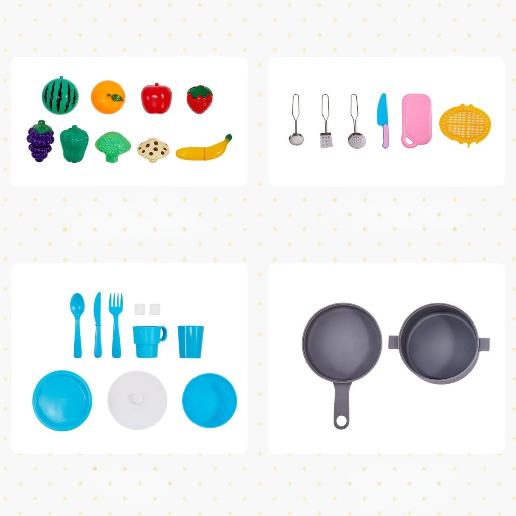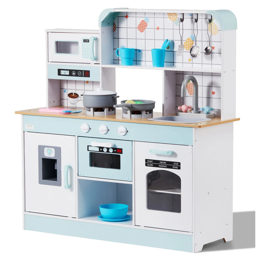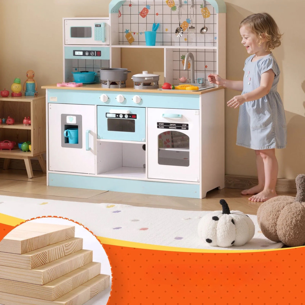 Gyerek játékkonyha fehér fa konyha fénnyel és hanggal, 24 kiegészítővel 3-8 éves kortól
