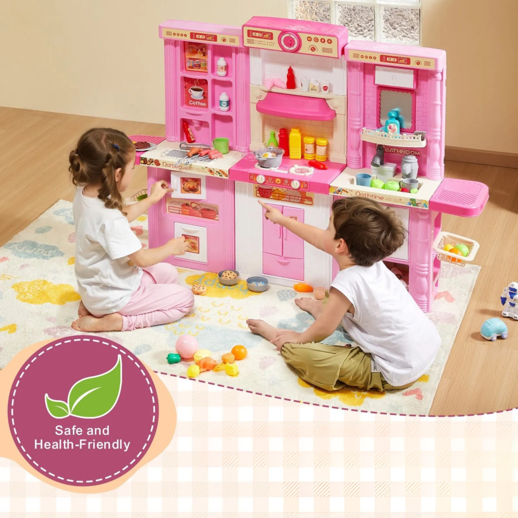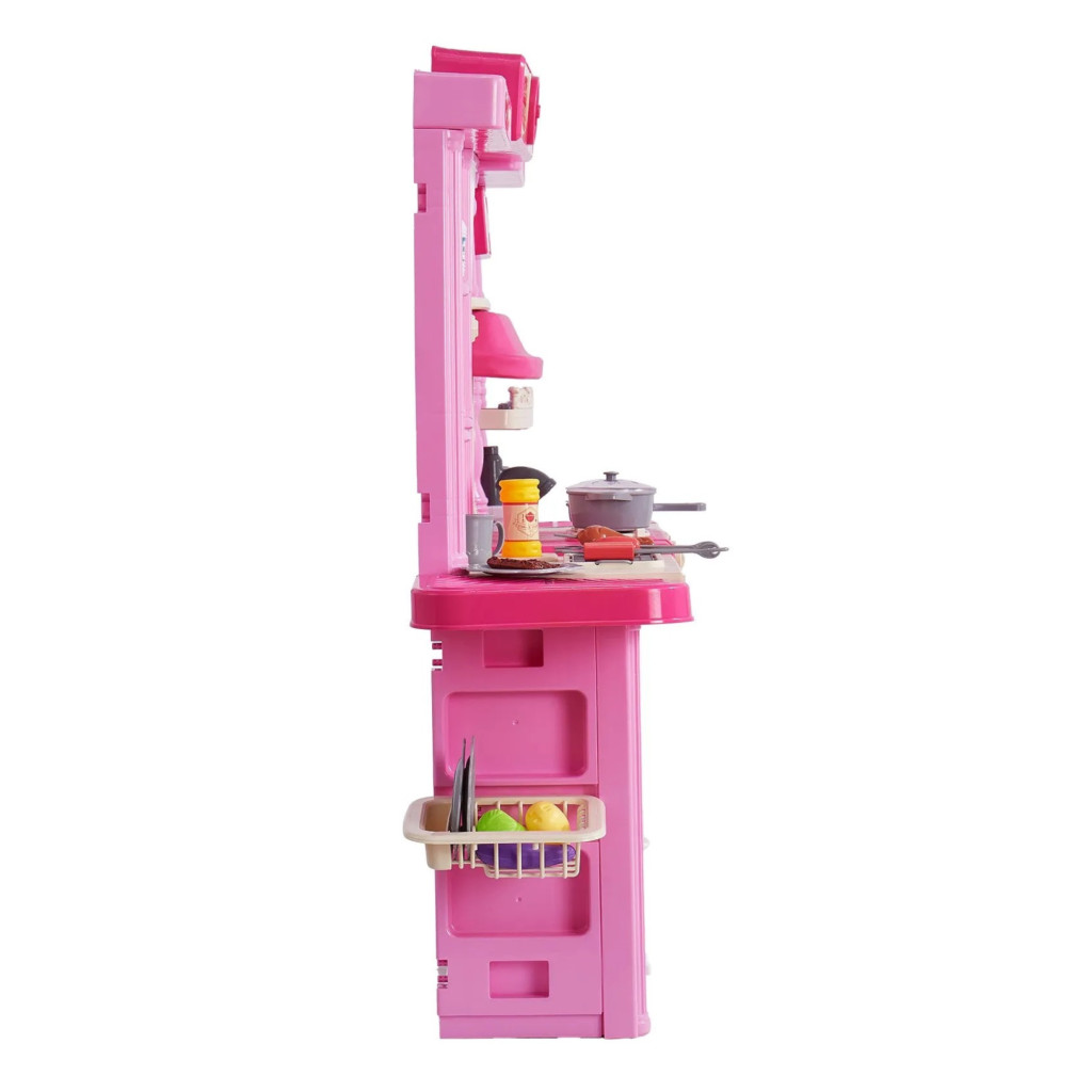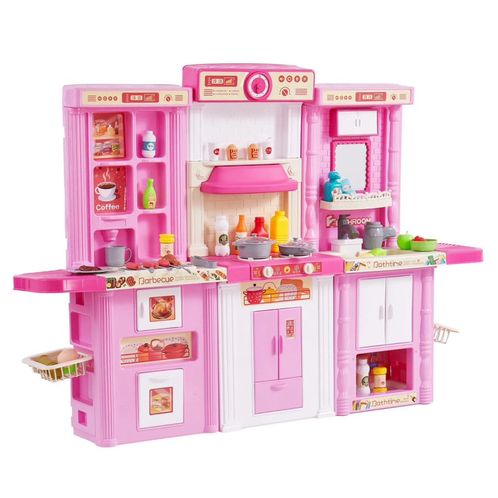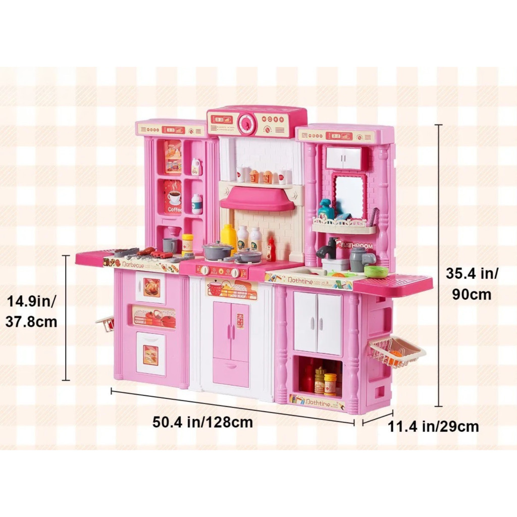 Gyerek játékkonyha 3 az 1-ben rózsaszín konyha gőz funkcióval, fénnyel és hanggal, 74 kiegészítővel