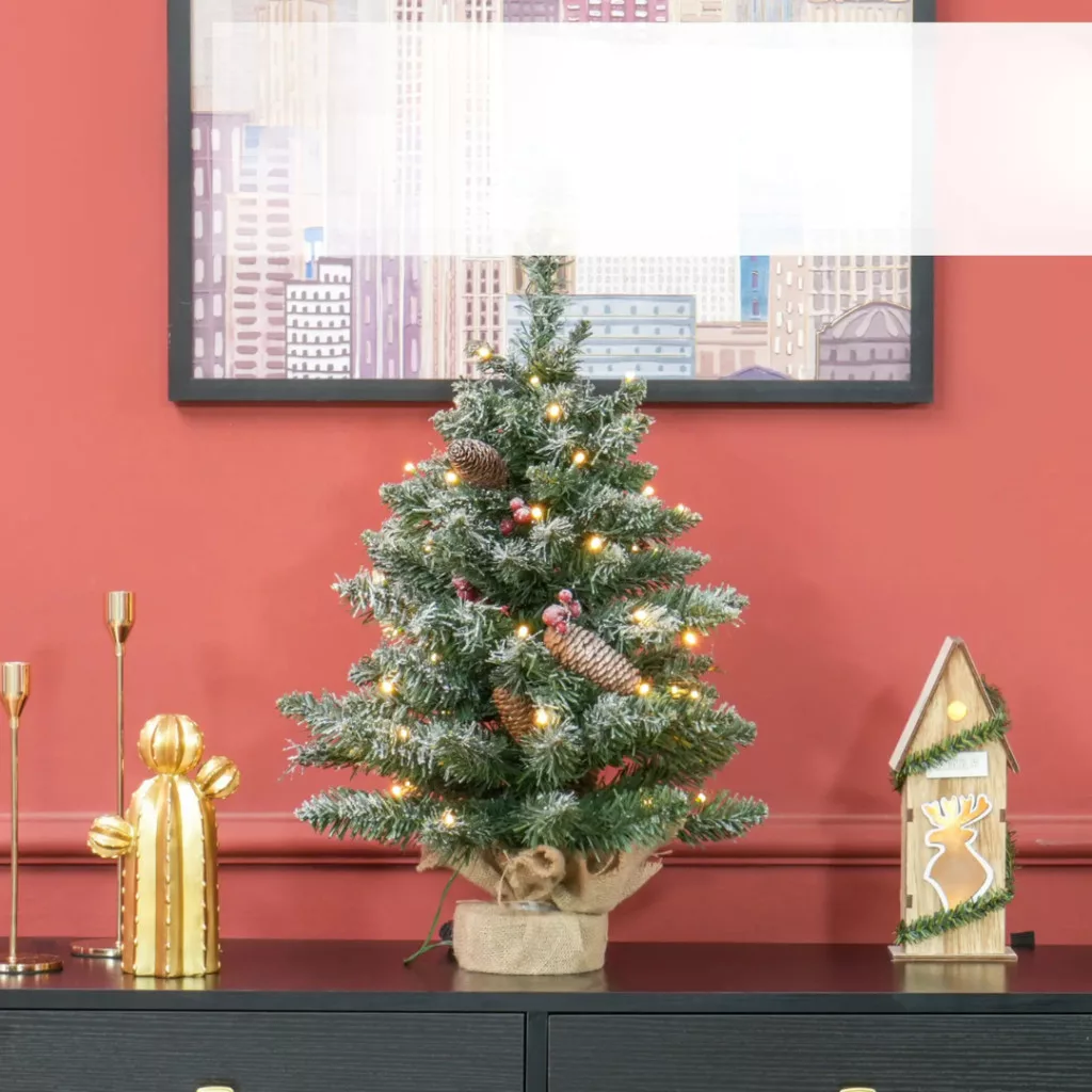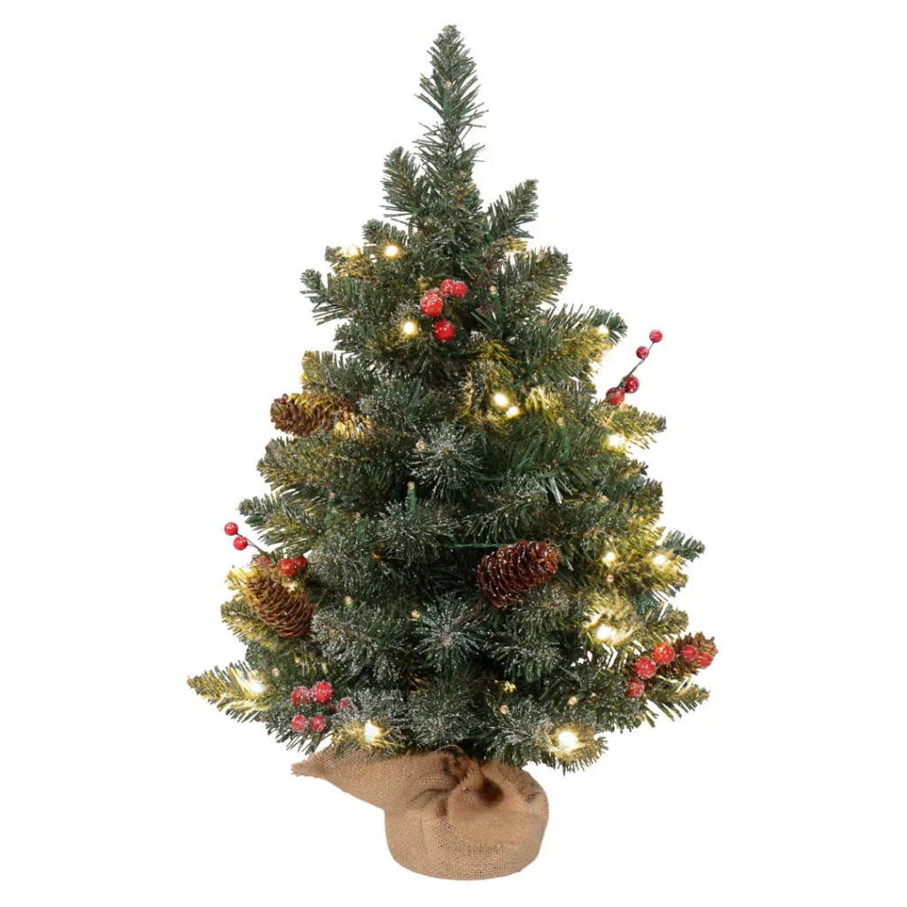 Műfenyő 60 cm LED-es mini havas hatású karácsonyfa, tobozokkal és vörös bogyókkal, stabil talppal
