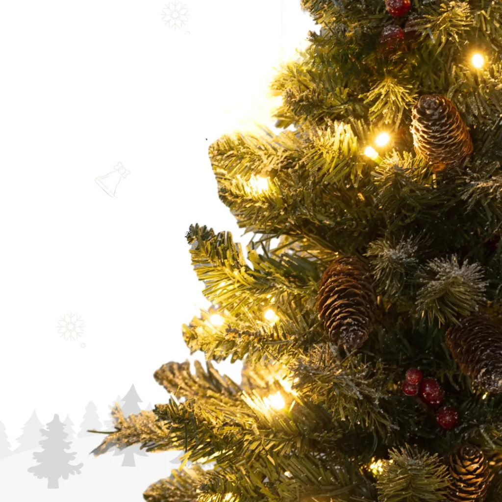 A műfenyő 50 beépített, melegfehér LED-izzóval rendelkezik, amelyek kellemes fényt árasztanak anélkül, hogy felmelegednének. A beépített 6 órás időzítő automatikusan ki- és bekapcsolja a fényeket, így kényelmesen élvezheti az ünnepi ragyogást.