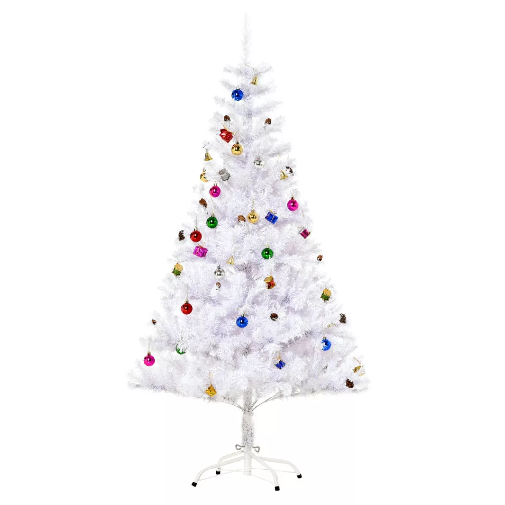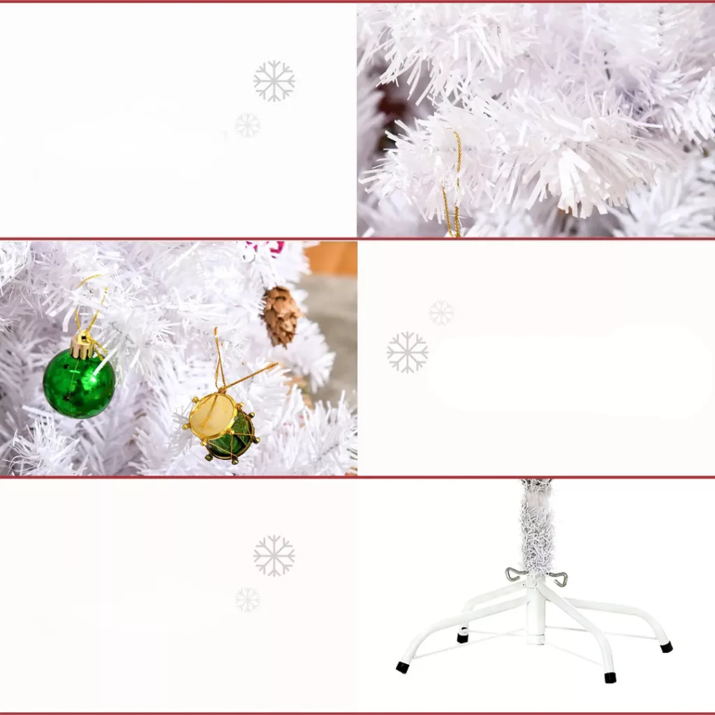 Műfenyő 150 m magas fehér karácsonyfa 680 ág, 12 toboz, díszekkel és fém állvánnyal