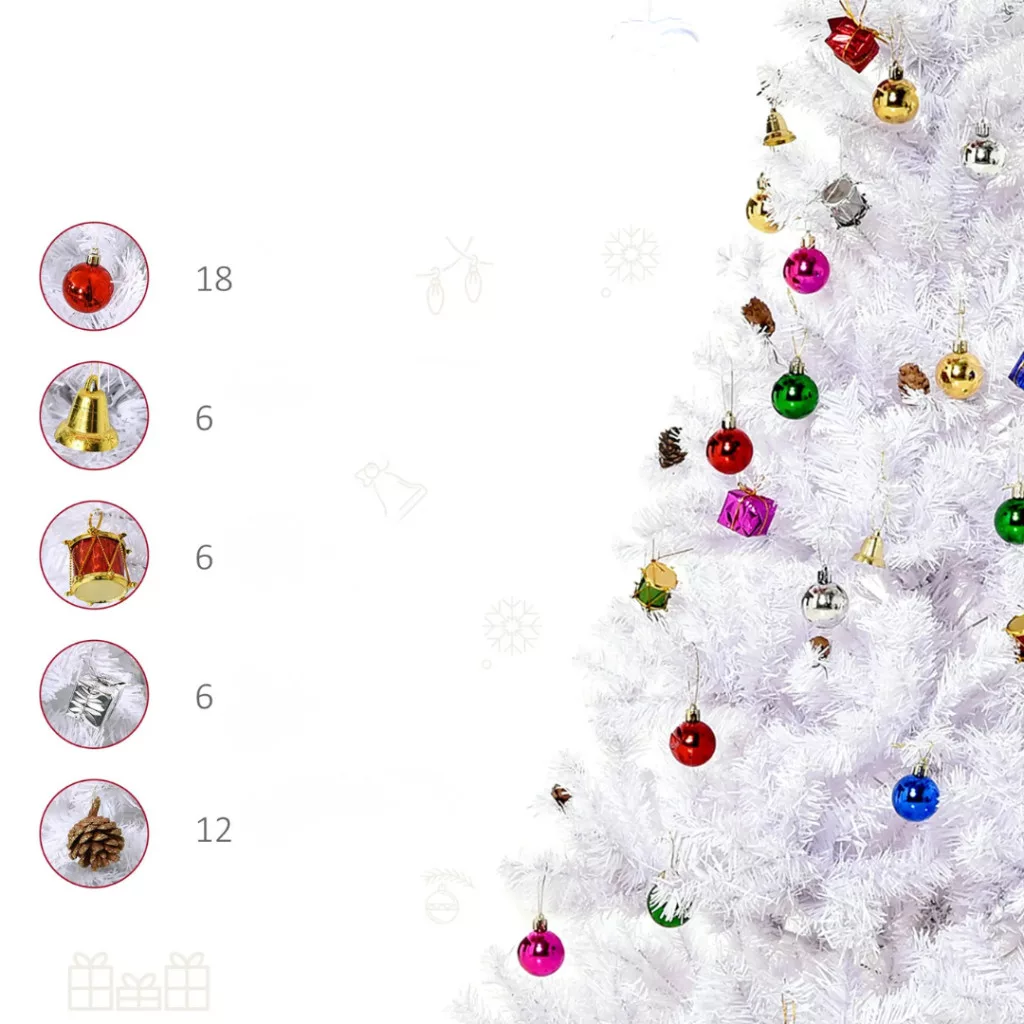 A gazdagon díszített, stílusos fehér fa klasszikus karácsonyi hangulatot teremt, miközben modern megjelenésével harmóniát sugároz bármely otthonban.