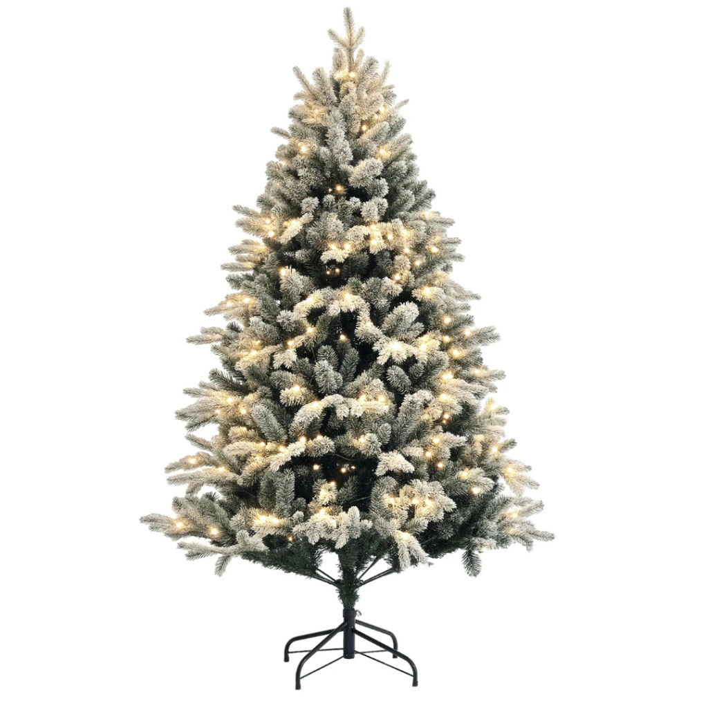 LED-es műfenyő 180 cm havas ágakkal, melegfehér fényekkel, fém talppal, tűzálló kivitel