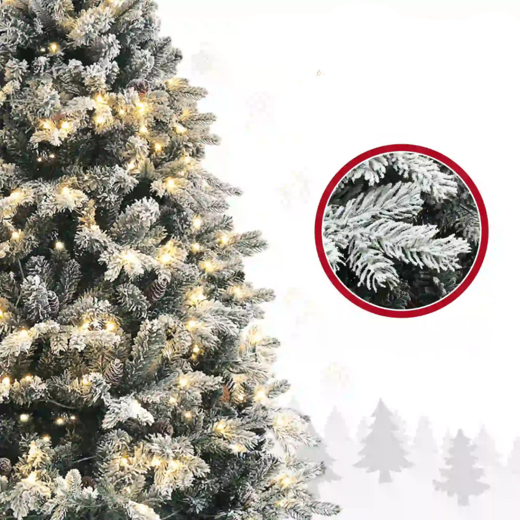 A műfenyő 793 sűrűn elrendezett ága élethű tűlevelű hatást kelt, a finom műhavas borítás pedig a frissen hullott hó érzetét hozza el nappalijába. A természetes zöld szín és a puha fehér árnyalatok harmóniája meghitt, elegáns karácsonyi atmoszférát teremt.
