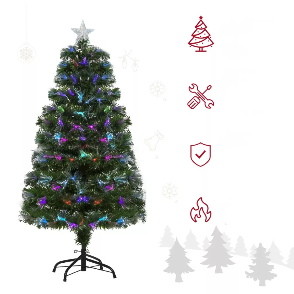 LED-es műfenyő, csillag díszcsúccsal 120 cm, zöld színű, fém talppal, 130 színes LED-fénnyel