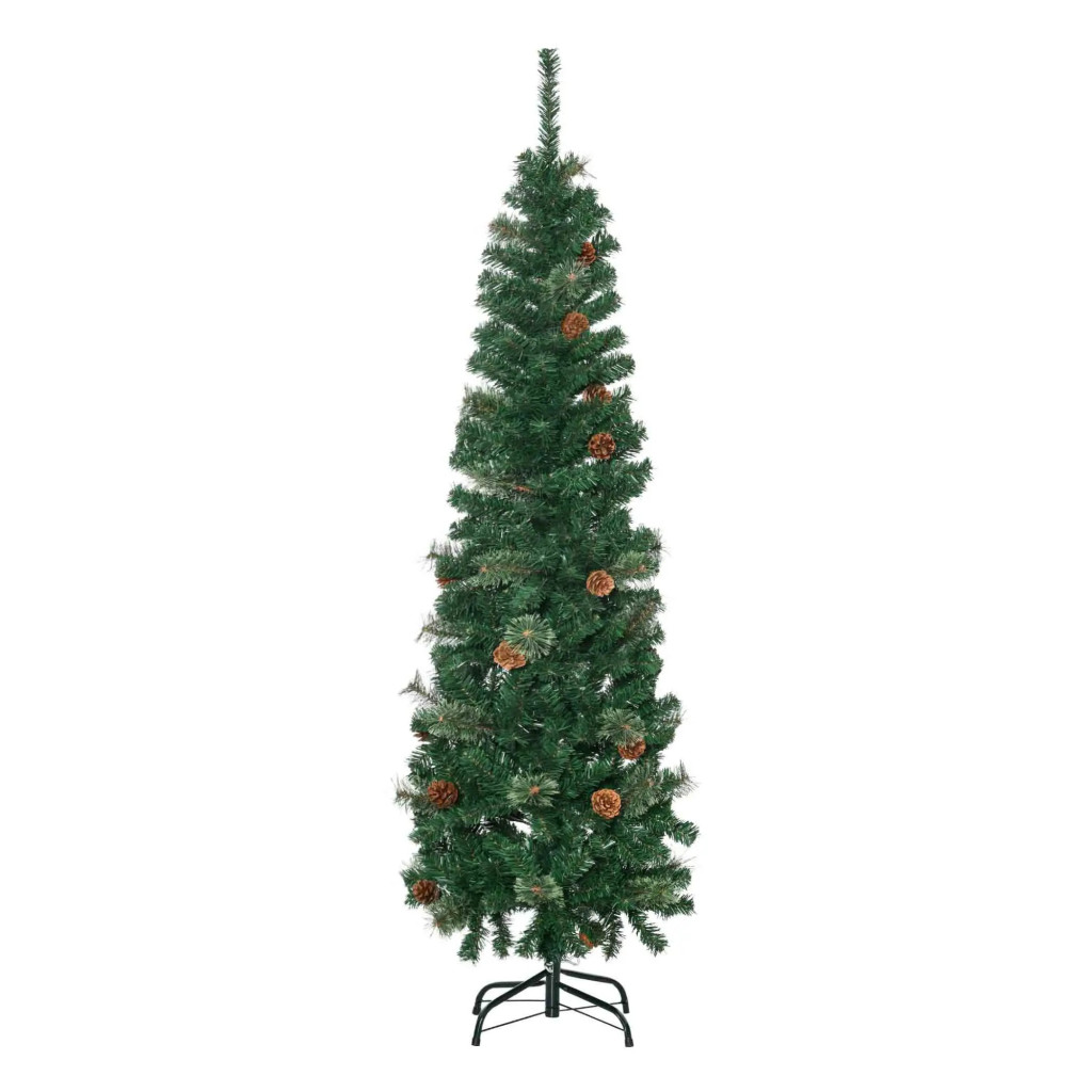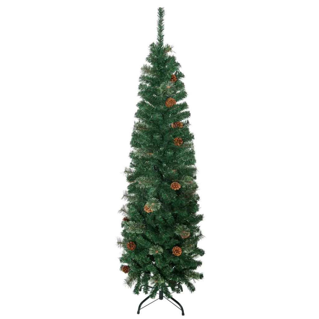 Műfenyő 46x165 cm keskeny karácsonyfa tobozokkal, lángálló ágakkal, stabil talppal, zöld