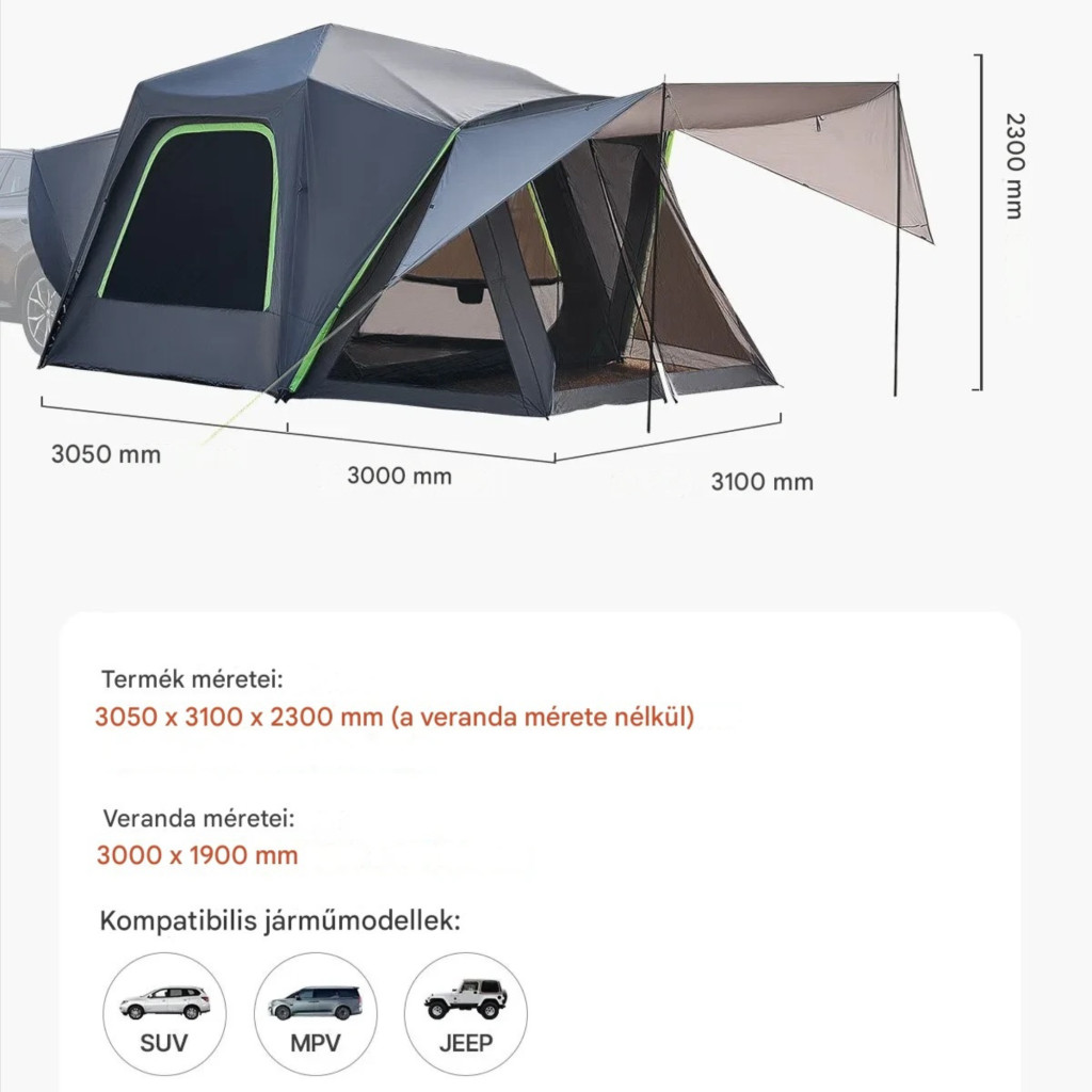 Kemping sátor terepjárókhoz 305x310x230 cm vízálló autós sátor napellenzővel 5–8 fő részére