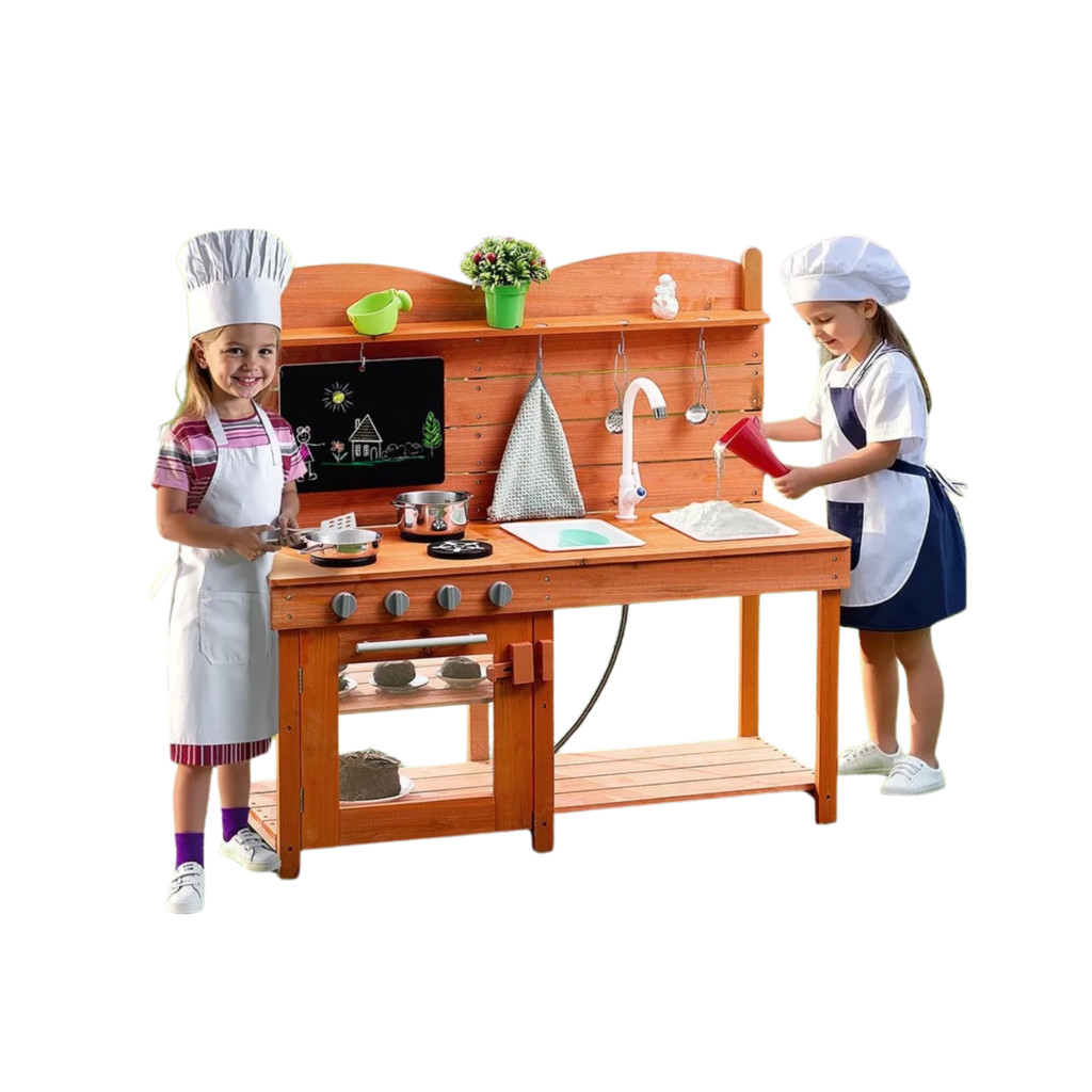 Engedje, hogy gyermeke felfedezze a főzés örömét a szabadban ezzel a különleges kerti gyerekkonyha megoldással! Ez a prémium minőségű, fából készült játék nemcsak szórakoztat, hanem fejleszti a kreativitást, a kézügyességet és a szociális készségeket is. A valósághű kialakításnak köszönhetően a gyerekek igazi kis séfként élhetik át a főzés élményét – akár a kertben, akár a teraszon.