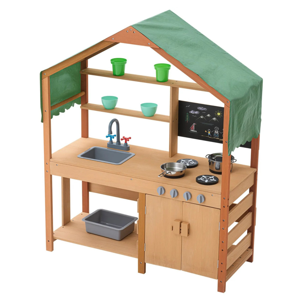 Gyerek sárkonyha tetővel kültéri fa játékkonyha kiegészítőkkel