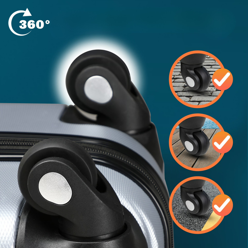 A négy darab, dupla kivitelű, PU bevonattal ellátott kerék teljes 360°-os elfordulást biztosít, így a bőrönd rendkívül könnyen irányítható zsúfolt helyeken is.
