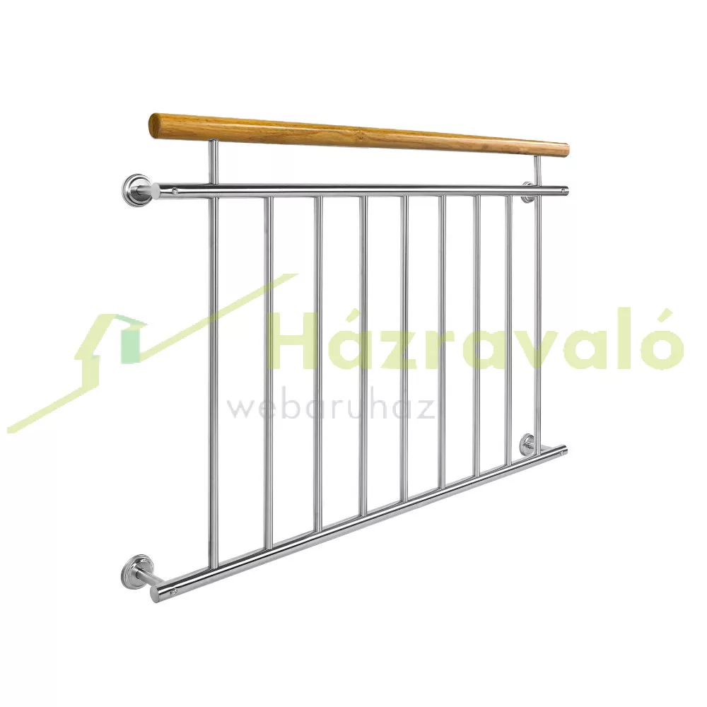 Franciaerkély korlát fa kapaszkodóval, mediterrán jellegű házra is, rozsdamentes acél, ezüst színben, 184x90 cm inox kivitel, maximális gyerek biztonság