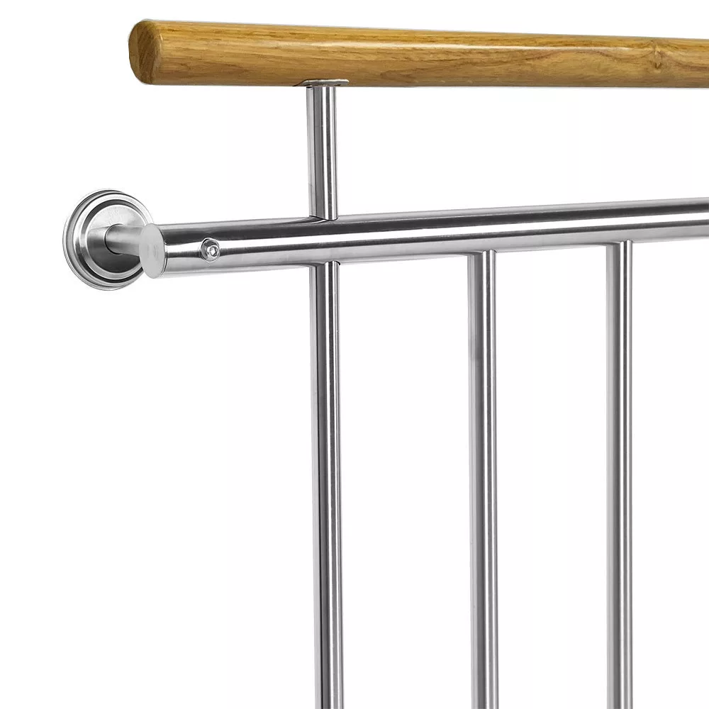 Franciaerkély korlát fa kapaszkodóval, mediterrán jellegű házra is, rozsdamentes acél, ezüst színben, 225x90 cm inox kivitel, maximális gyerek biztonság