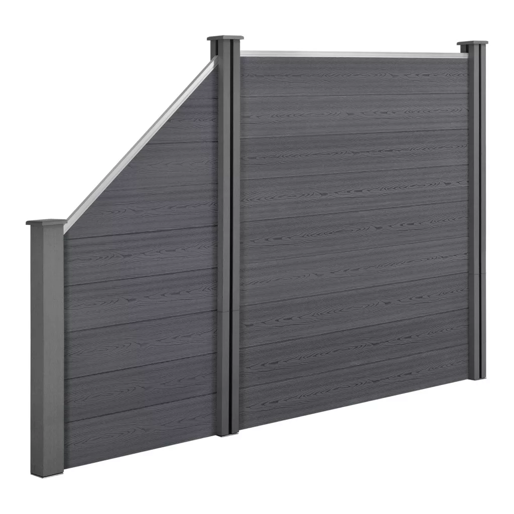 A szett különlegessége a ferde kerítéselem, amely a hagyományos, egyenes WPC-panel mellett rugalmas alkalmazást tesz lehetővé: akár terepeséshez igazodna, akár esztétikai tagolást szeretne létrehozni, ez a kerítés minden esetben letisztult, modern és egységes látványt biztosít.