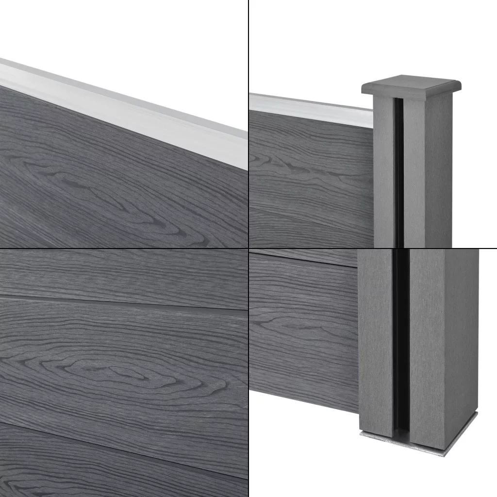 A szett tartalmaz négyszögletes és ferde kerítéselemeket, így esztétikus átmenetet biztosít kapubejárókhoz, lejtős területekhez vagy eltérő magasságú szakaszokhoz. A masszív alumínium lezáróelemek, a stabil WPC oszlopok és a strapabíró acél lábak garantálják a hosszú távú stabilitást.