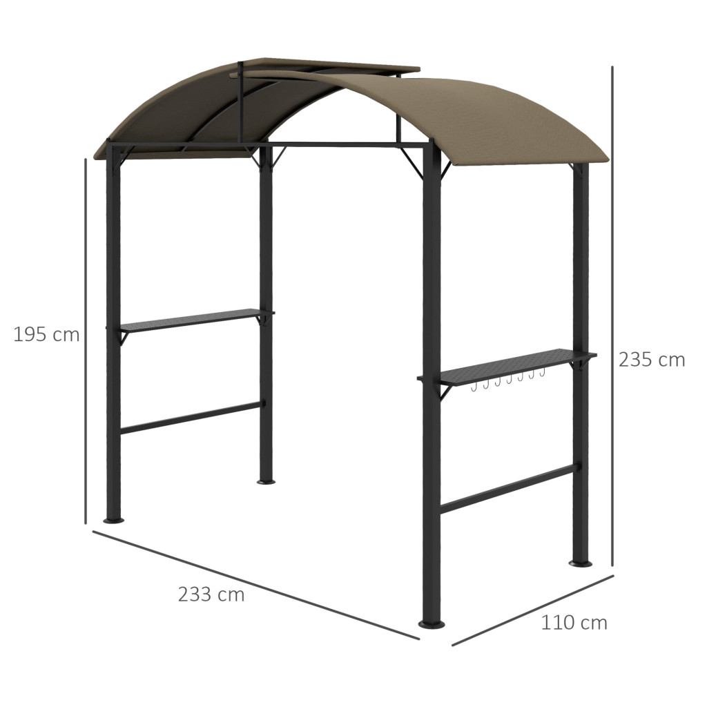 Ez a grillpavilon polcokkal ideális választás minden szabadtéri grillezéshez. A 233 × 110 cm méretű BBQ pavilonpraktikus árnyékolást biztosít a grill fölött, miközben kényelmes munkaterületet teremt a grillezéshez. A stabil acélváz és az időjárásálló poliészter tető lehetővé teszi, hogy Ön kényelmesen grillezhessen még napsütéses időben is.
