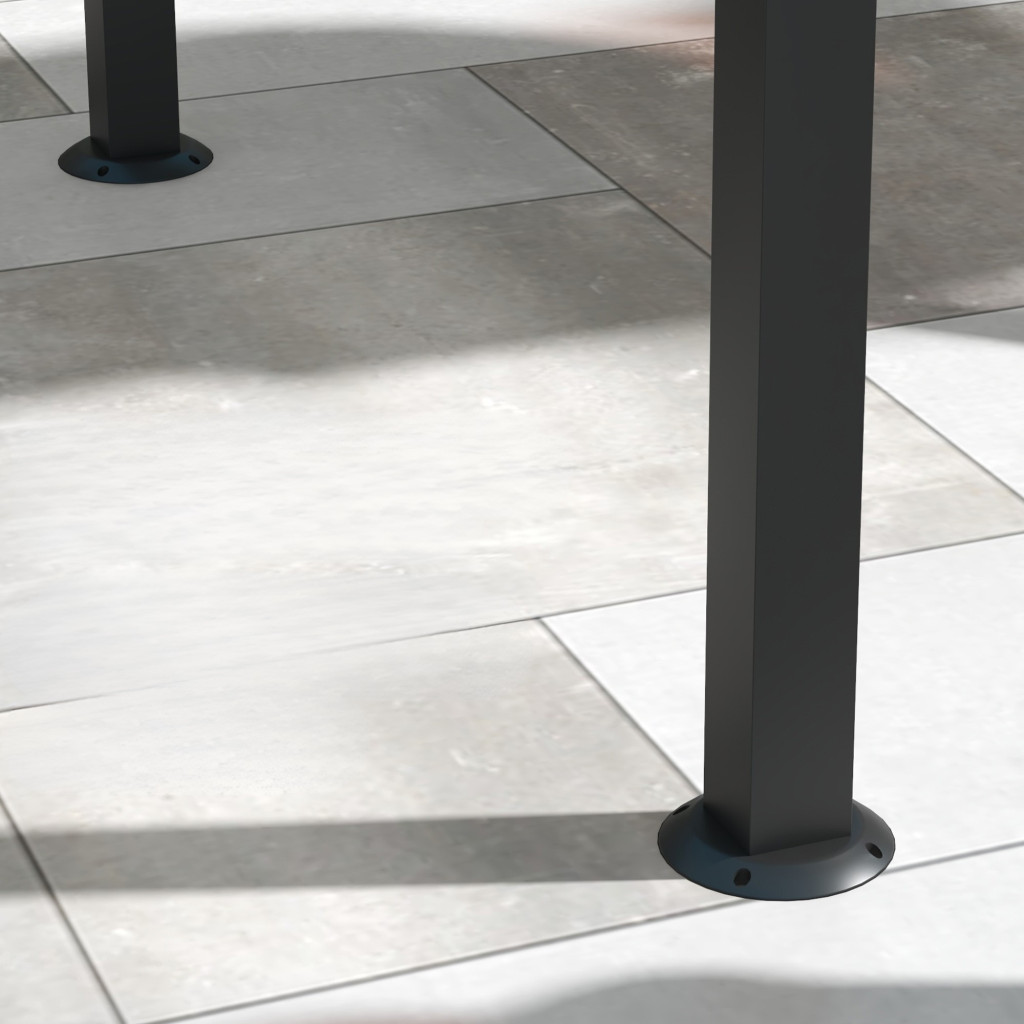 A szerkezet porszórt bevonatú acélvázzal készült, amely ellenáll a korróziónak és a kültéri használatnak.