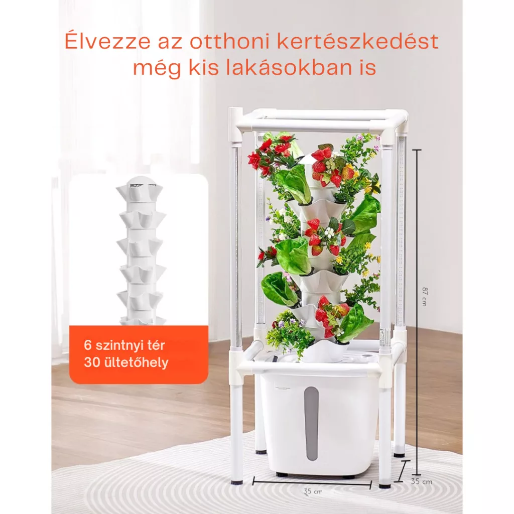 Fedezze fel a modern hidroponikus kertészkedés előnyeit ezzel a fejlett termesztőtoronnyal, amely ideális választás otthonába, akár konyhába, erkélyre vagy kisebb lakásba. A 6 szintes, helytakarékos vertikális rendszer 30 ültetőhelyet kínál, mérete mindössze 43 × 43 × 100 cm, így lehetőséget biztosít arra, hogy kis területen is bőséges termést neveljen – föld nélkül, tisztán és hatékonyan.
