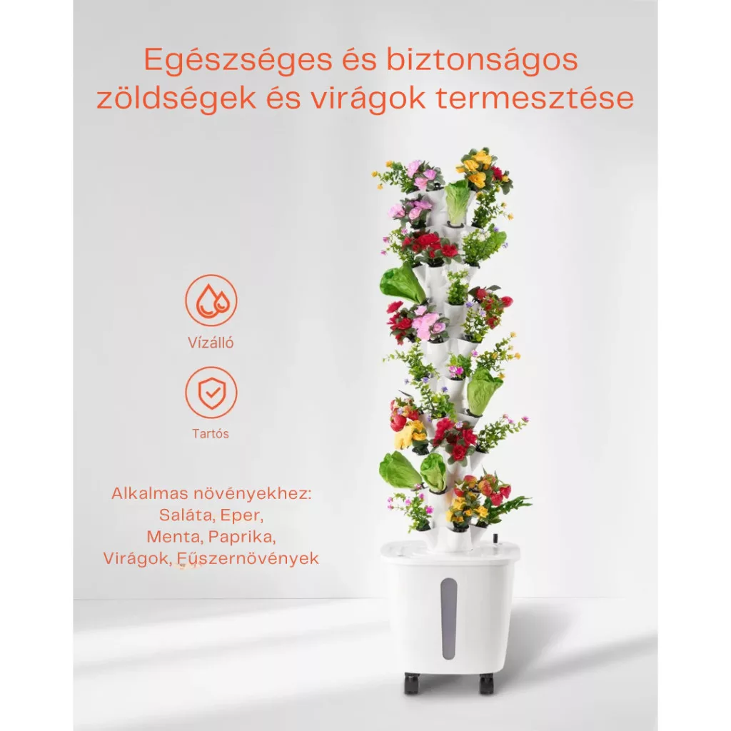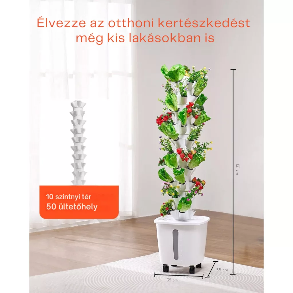 Hidrokultúrás növénytermesztő torony – 50 ültetőhellyel, 10 szintes kialakítással, kerekekkel, vízszivattyúval és időzítővel