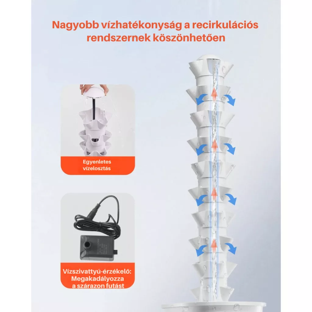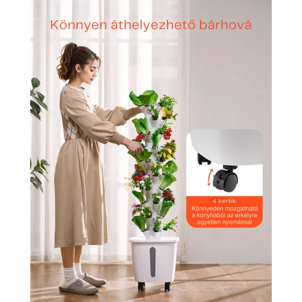 A kompakt torony kialakítása maximális kihasználtságot biztosít, miközben modern, esztétikus kiegészítője lehet otthonának. Ideális megoldás azok számára, akik egészséges, friss zöldséget, gyümölcsöt és fűszernövényt szeretnének termeszteni a mindennapokra.