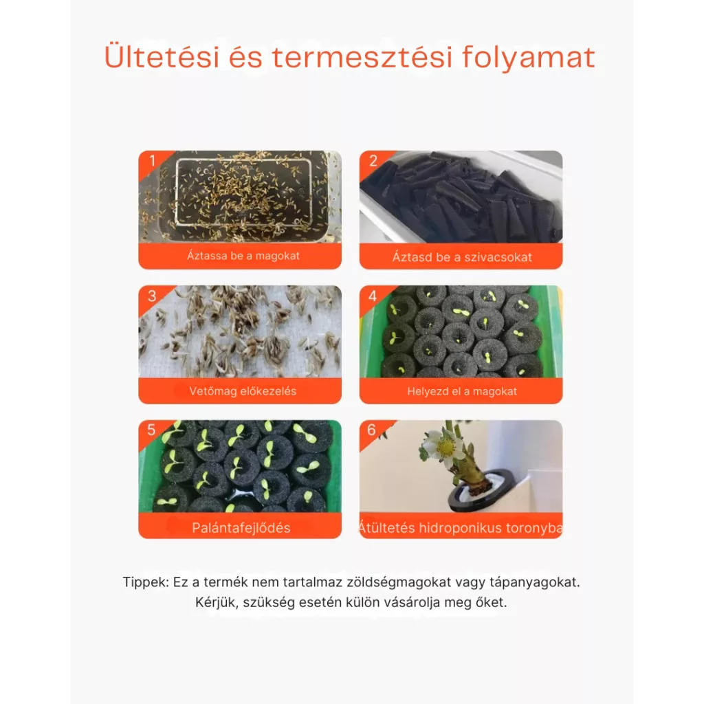 A rendszer kiváló minőségű ABS és PP anyagból készült, amely tartós, vízálló és teljesen biztonságos. Ideális választás salátafélék, eper, fűszernövények, menta, bazsalikom, virágok és más növények termesztésére – mindezt talaj nélkül, higiénikus környezetben.
