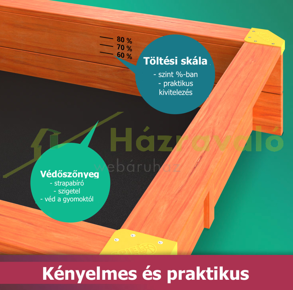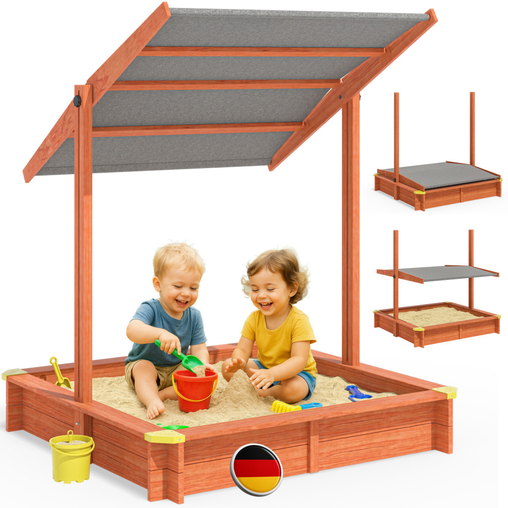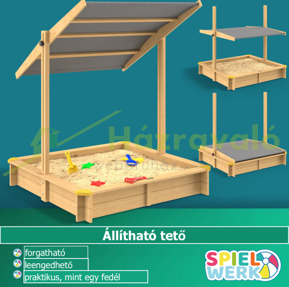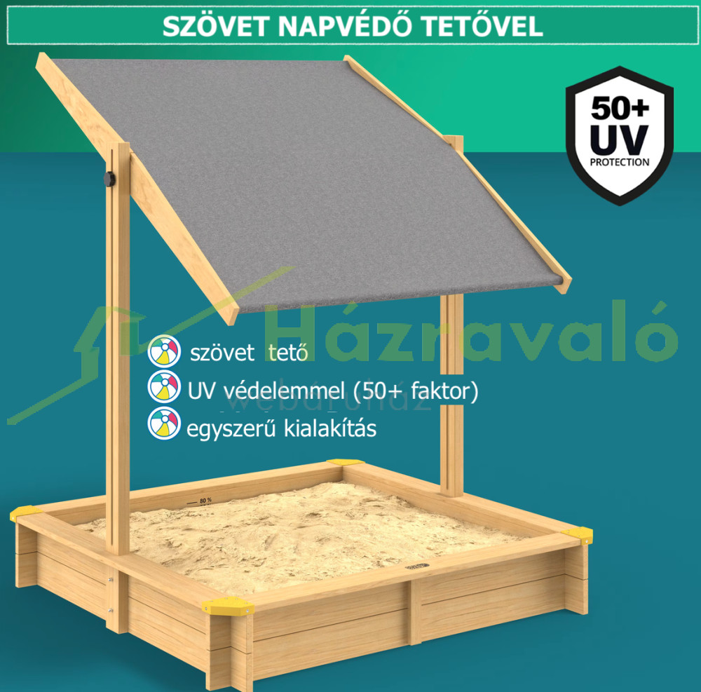 Homokozó fedett 120x120x120 cm tető állítható magasságú és dönthető, vöröses fenyőfa homokozó antracit tetővel