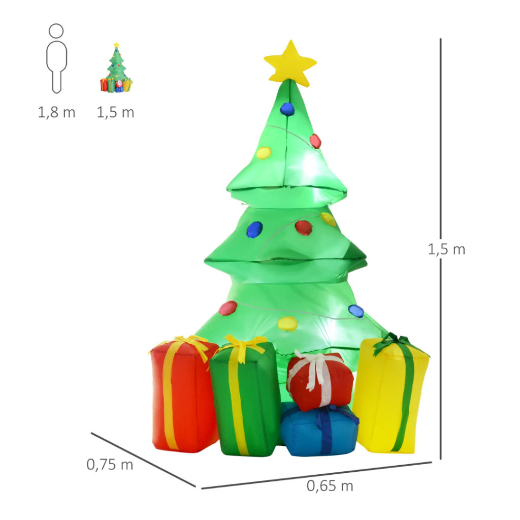 Tegye ünnepivé kertjét, teraszát vagy bejáratát ezzel a 150 cm magas, felfújható karácsonyi dekorációval, amelyet színes ajándékdobozok és beépített LED-fények díszítenek. Ez a kedves karácsonyfa alakú dekoráció garantáltan mosolyt csal mindenki arcára, és igazi ünnepi hangulatot varázsol otthonába – kívül és belül egyaránt.