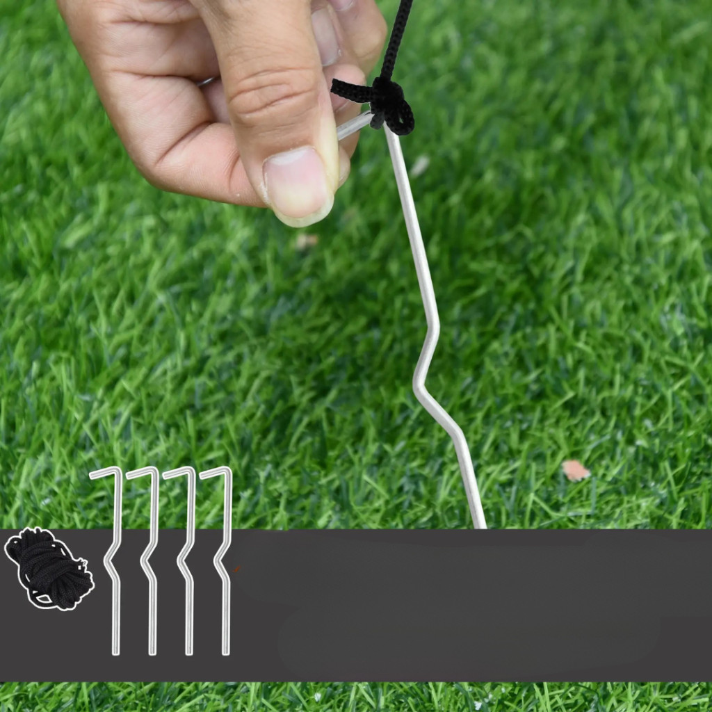 A csomag tartalmaz 4 földhorgonyt és 2 rögzítőkötél elemet, melyek segítségével a dísz szilárdan rögzíthető a talajhoz.