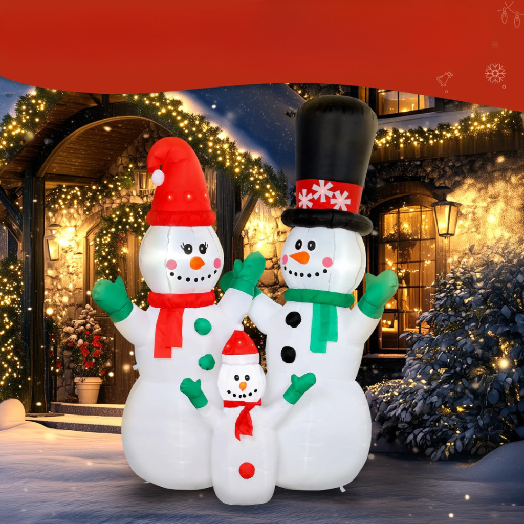 A dekoráció három bájos hóembert ábrázol, akik együtt ünneplik a karácsonyt – egy igazi családi jelkép. A színes sálak, sapkák és a mosolygós arcok kedves, meghitt hangulatot visznek minden környezetbe. A 1,8 méteres magasság miatt ideális kerti dísznek, bejárati dekorációnak vagy rendezvényekhez.