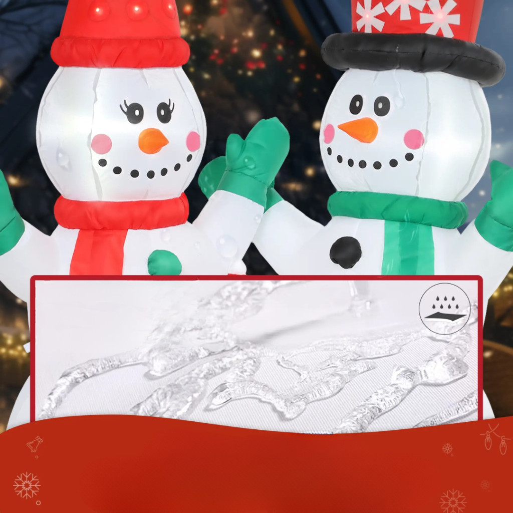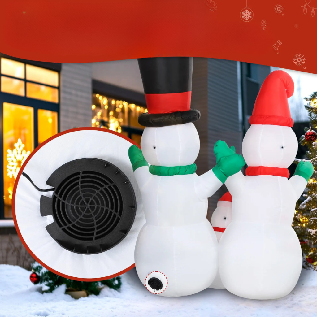 A dekoráció beépített ventilátorral rendelkezik, amely automatikusan felfújja a hóembereket néhány perc alatt. Nincs szükség kézi pumpára – csak csatlakoztassa a konnektorhoz, és máris élvezheti a karácsonyi látványt. A csomagban található 4 rögzítőcövek, 2 feszítőkötél és 3 homokzsák, melyekkel stabilan rögzíthető kültéren is.