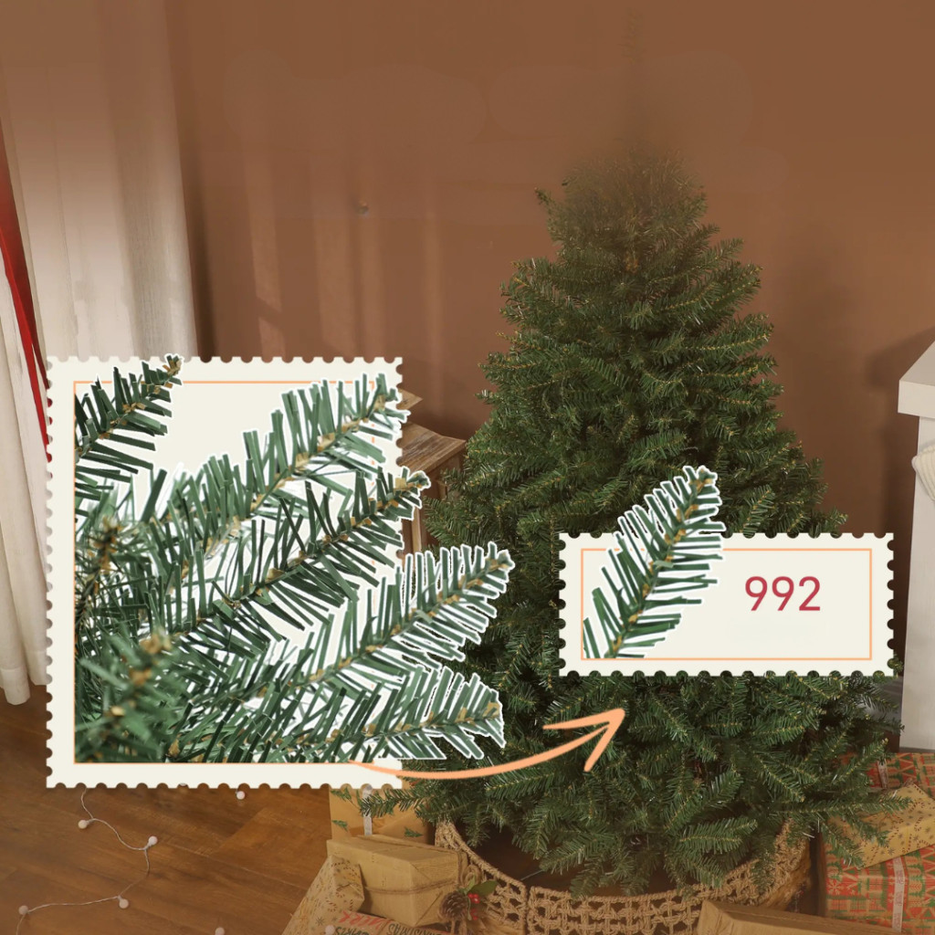 A műfenyő 992 dús, sűrű ágheggyel rendelkezik, melyek valósághűen imitálják a természetes fenyőfa megjelenését. Az ágak elrendezése harmonikus, telt hatást kelt, így a fa igazi karácsonyi központi dísz lehet otthonában.