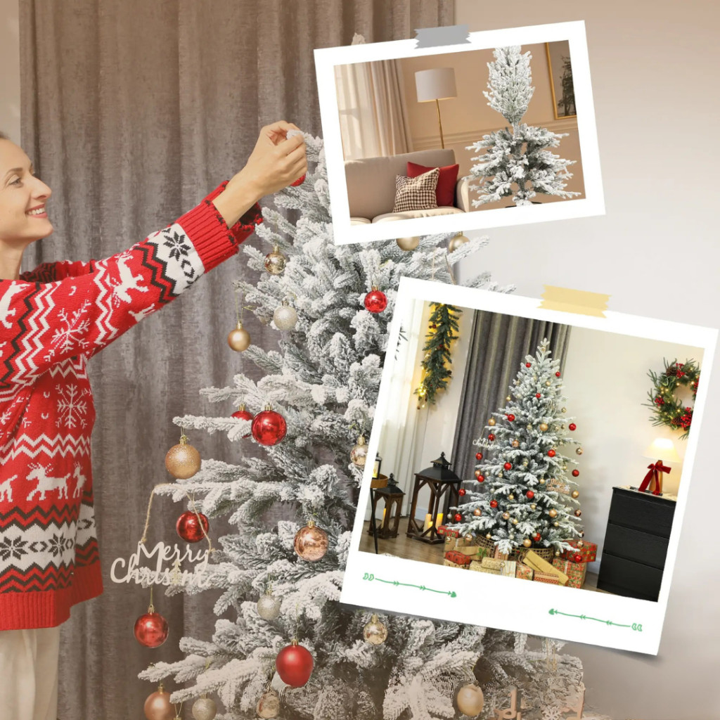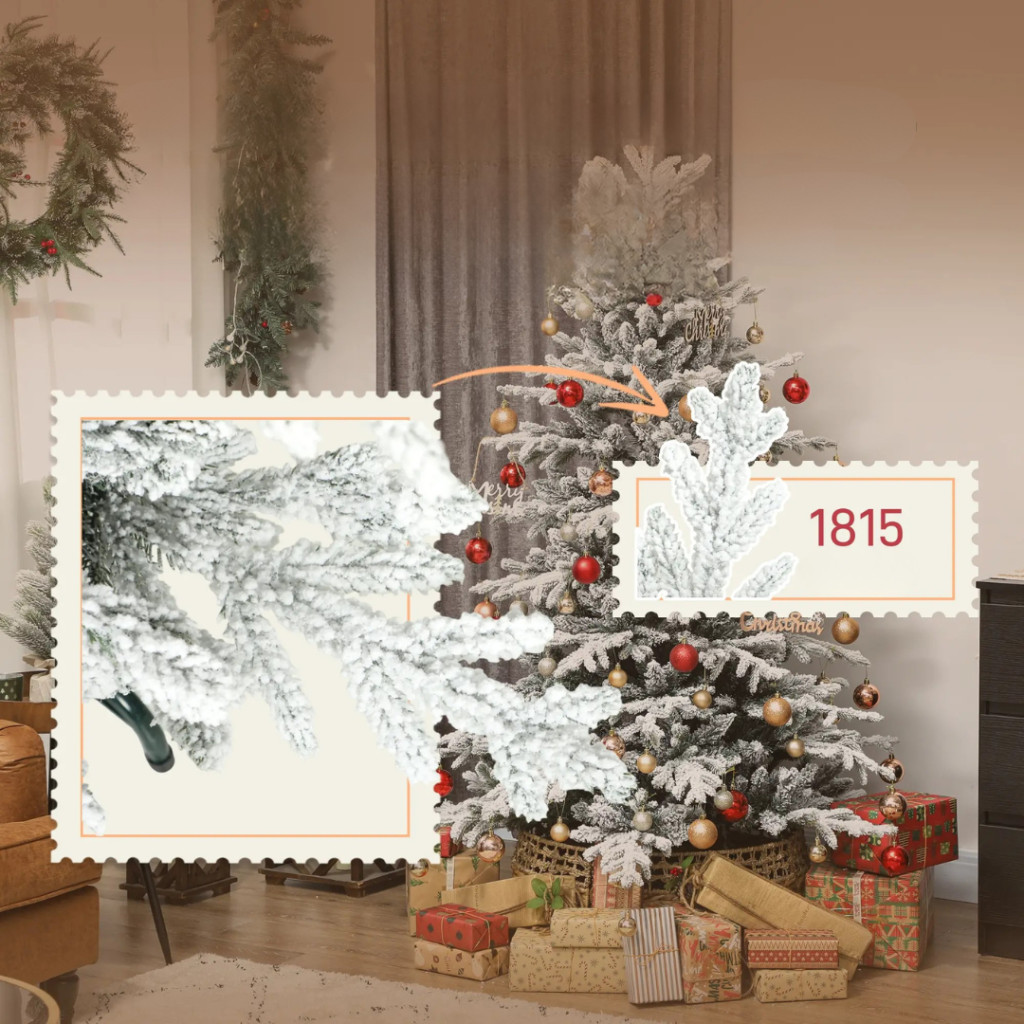A karácsonyfa hóval borított tűlevelei valósághűen utánozzák az igazi fenyőt, így minden szögből dús, természetes megjelenést nyújt. Az 1815 ág kivételes sűrűséget biztosít – tökéletes alapot a gömbök, fényfüzérek és egyéb karácsonyi díszek számára.