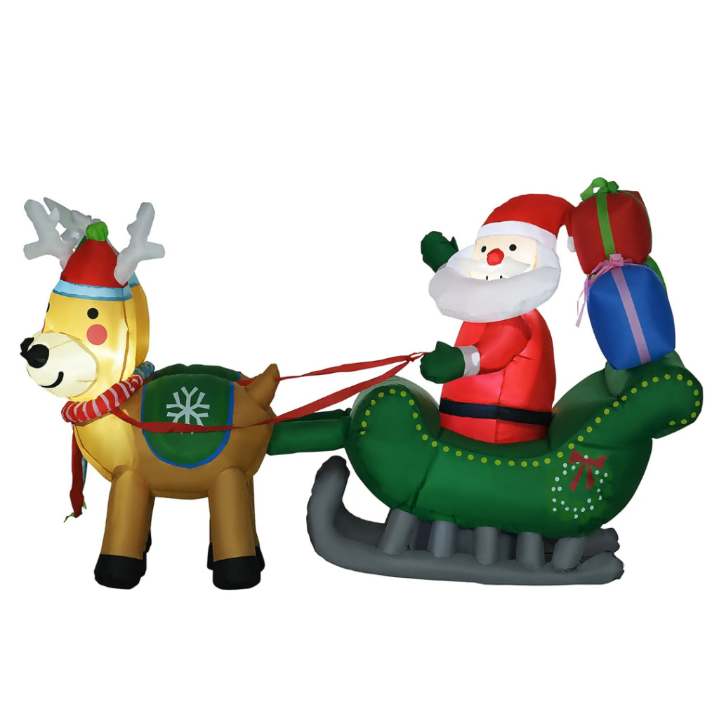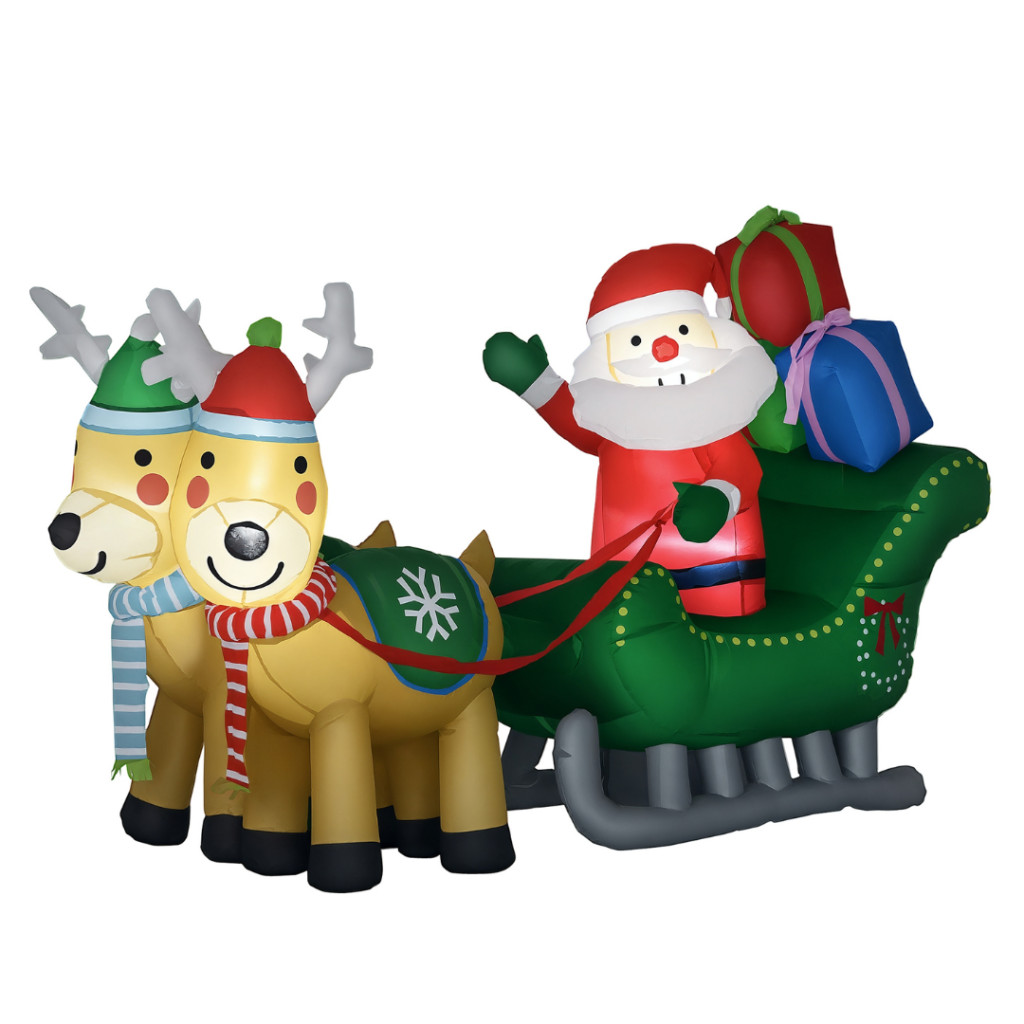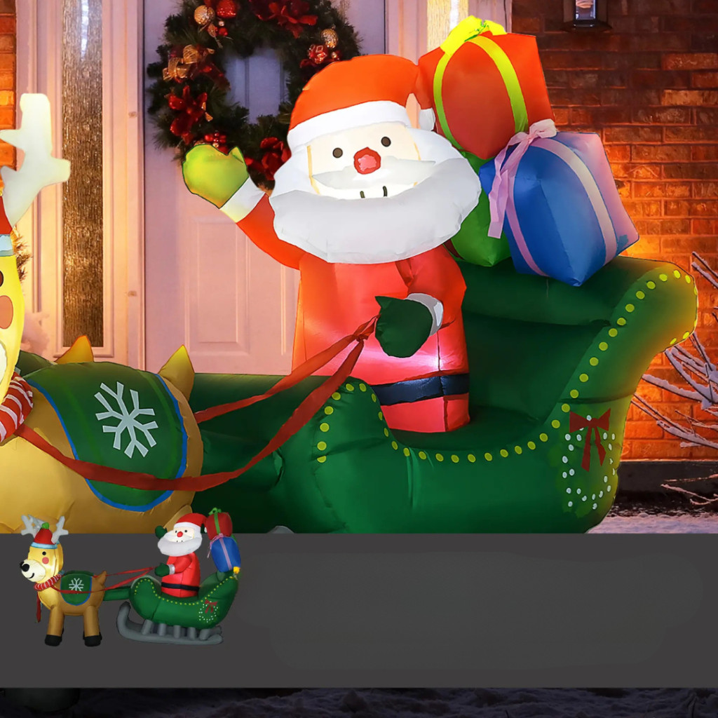 Varázsolja kertjét igazi karácsonyi mesebirodalommá ezzel a látványos, 210 cm hosszú felfújható Mikulás-szán dekorációval, amelyen a Mikulás két rénszarvassal érkezik!