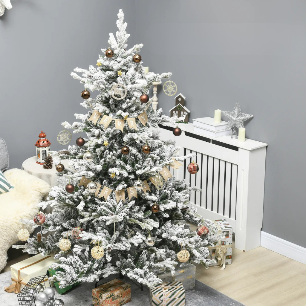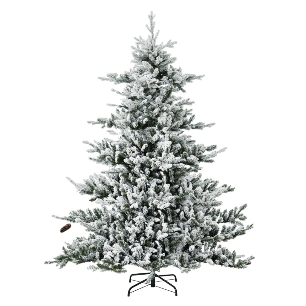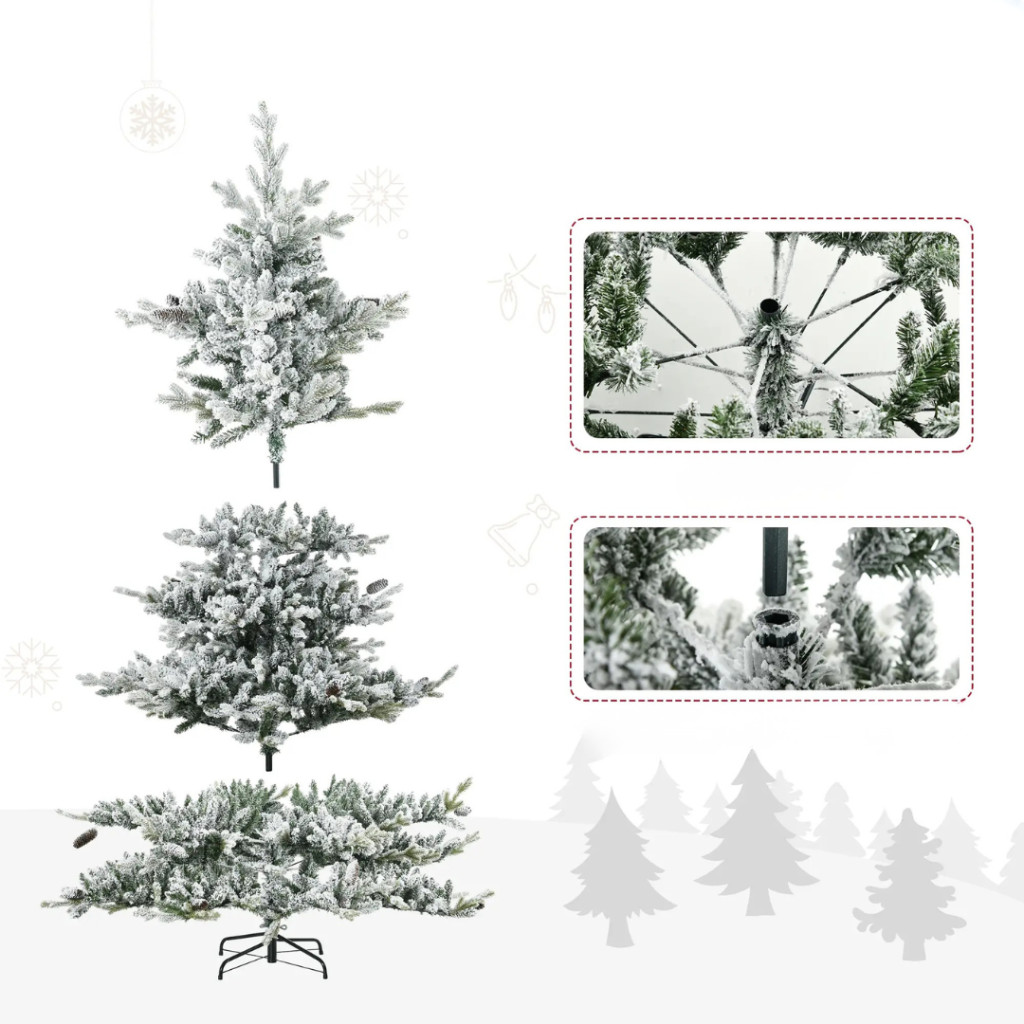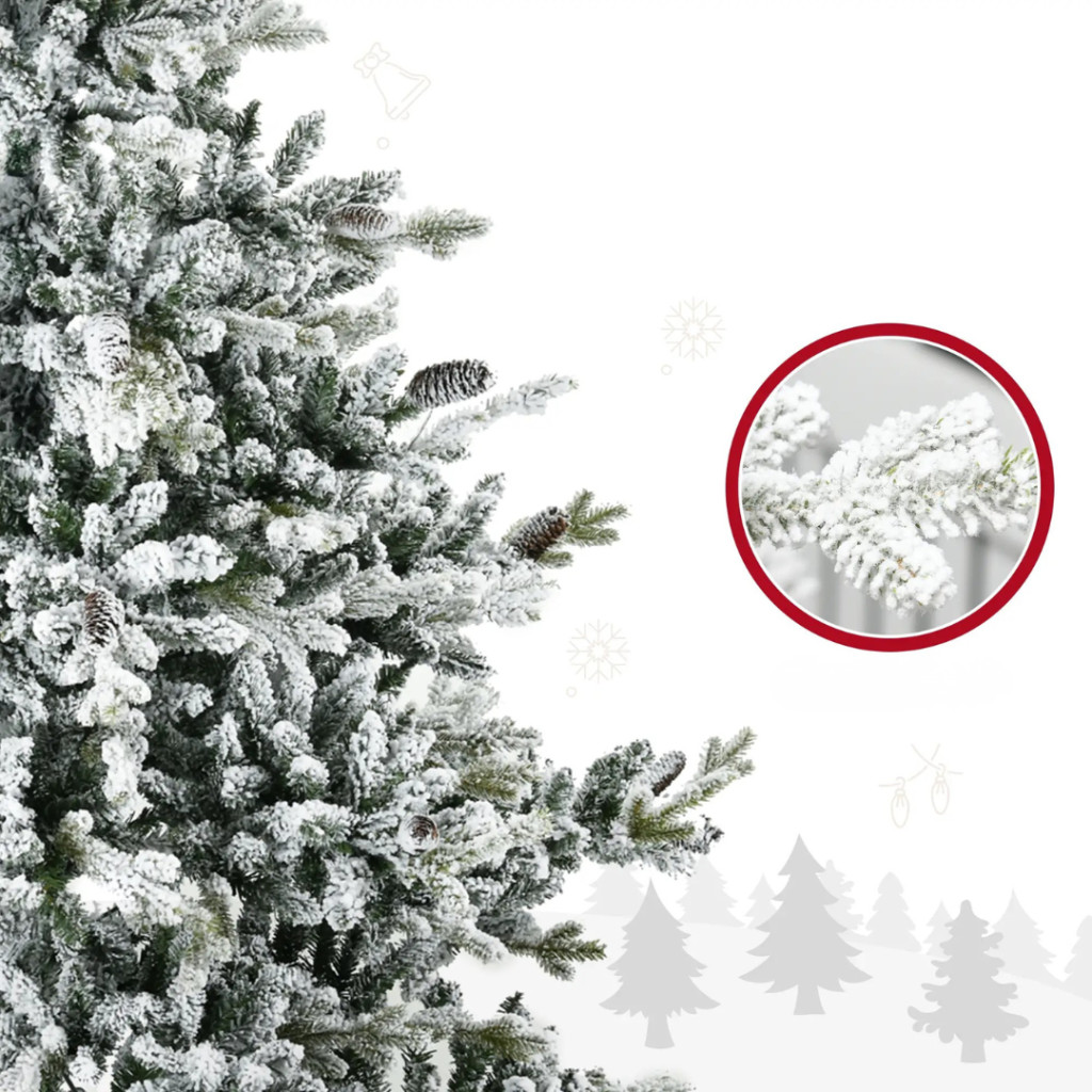 Műfenyő 180 cm havas hatású karácsonyfa dús koronával, élethű megjelenéssel, tobozokkal díszítve