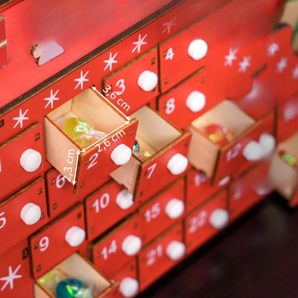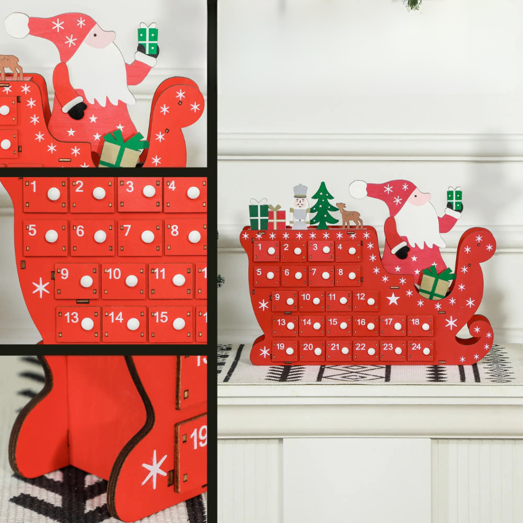 Fa adventi naptár 22,5x8x36 cm Mikulás szánon, 24 rekeszes karácsonyi öröknaptár piros