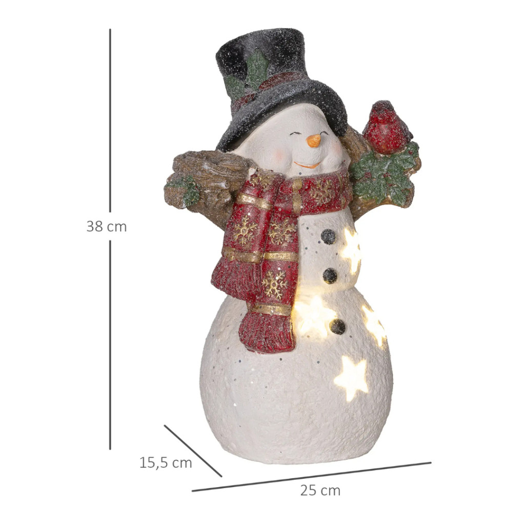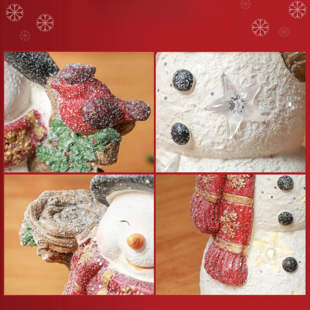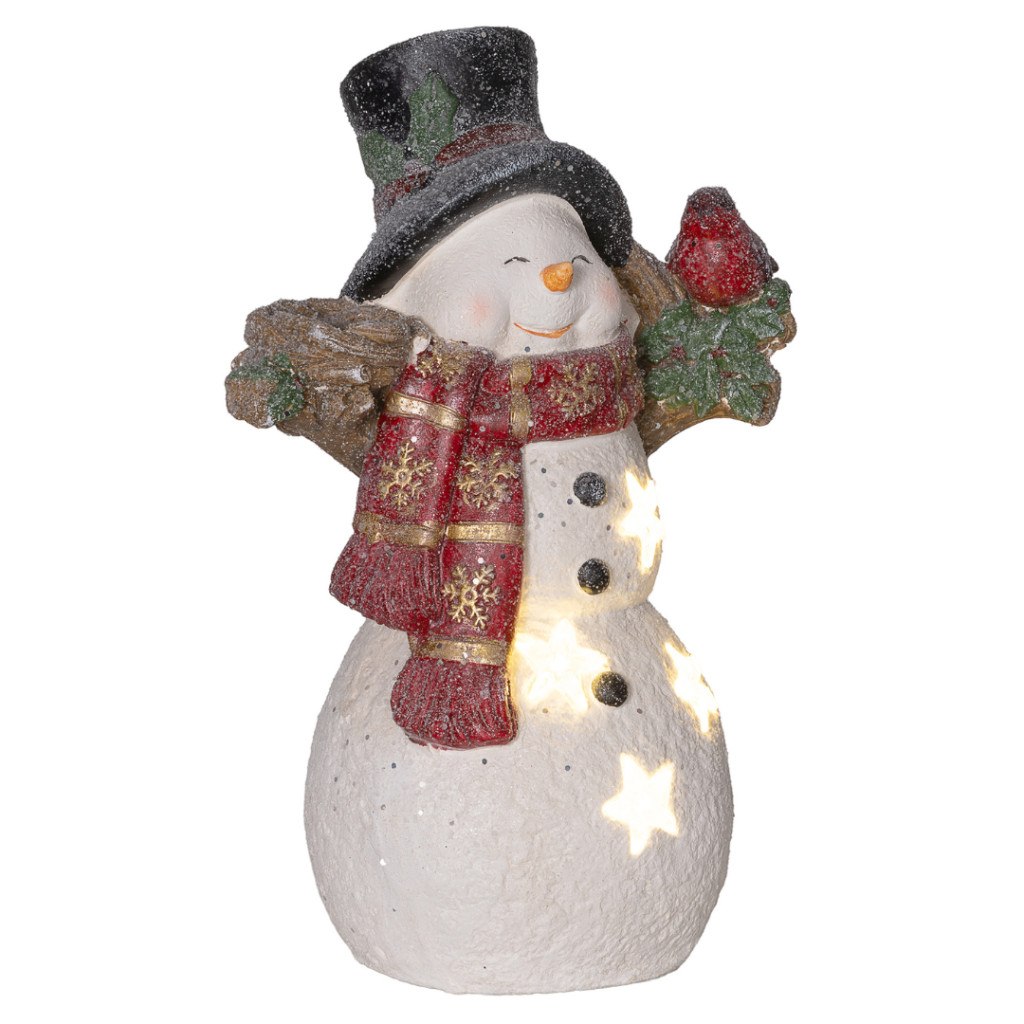 A kedvesen megformált hóember figura egy kis madárral a vállán a barátság és a szeretet szimbóluma. Tökéletes választás azoknak, akik meleg, családias karácsonyi hangulatot szeretnének teremteni – akár beltéren, akár fedett kültéren.