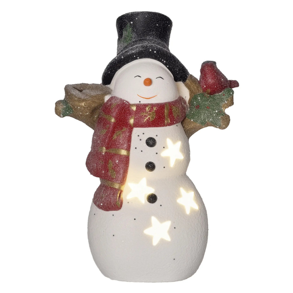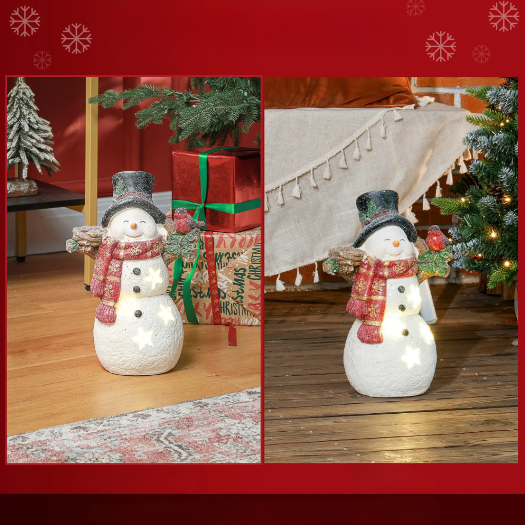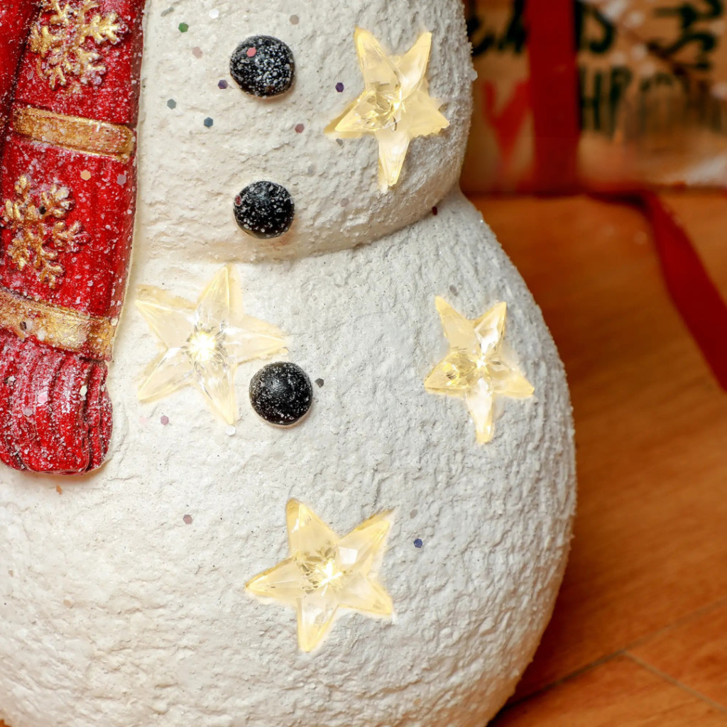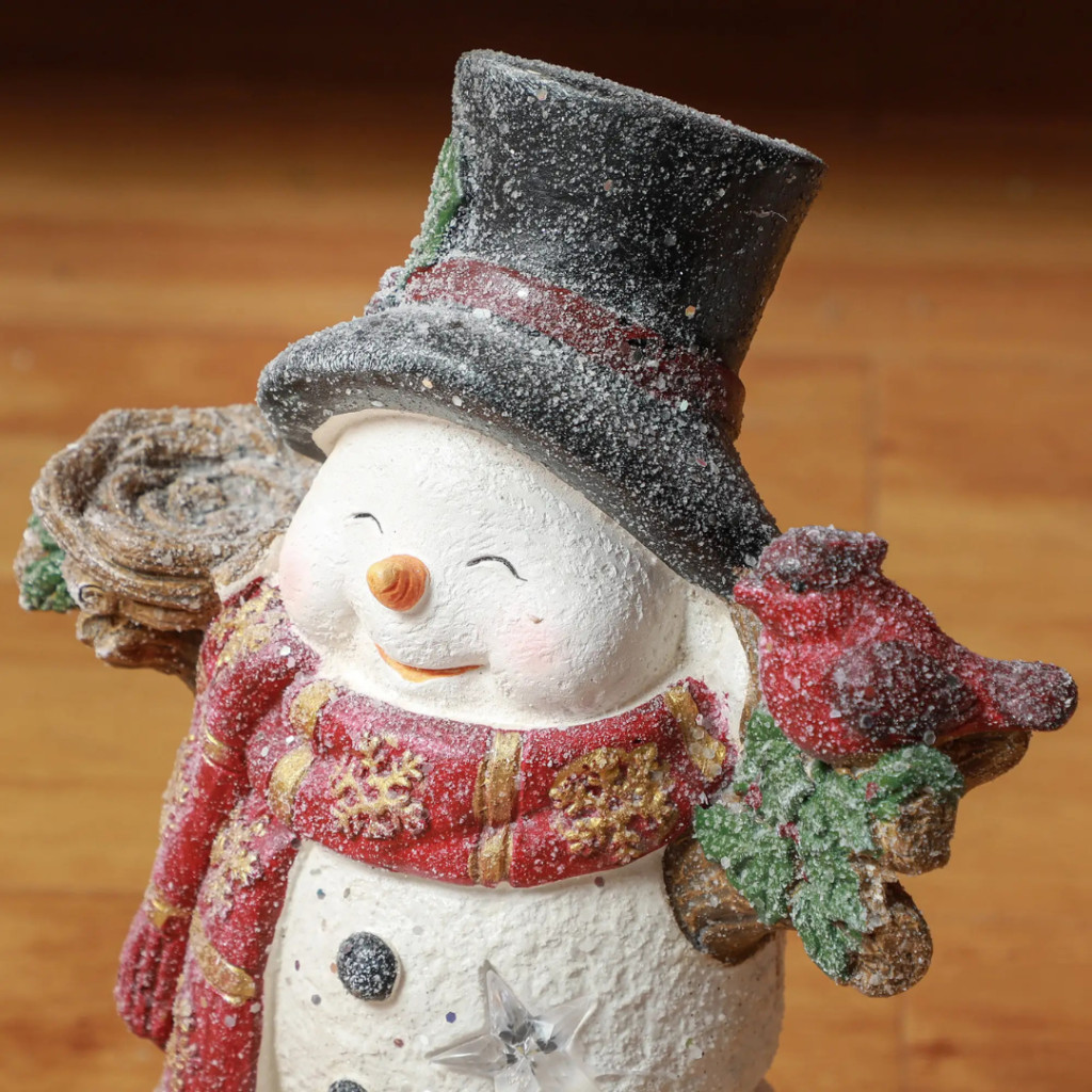 A kedvesen megformált hóember figura egy kis madárral a vállán a barátság és a szeretet szimbóluma. Tökéletes választás azoknak, akik meleg, családias karácsonyi hangulatot szeretnének teremteni – akár beltéren, akár fedett kültéren.