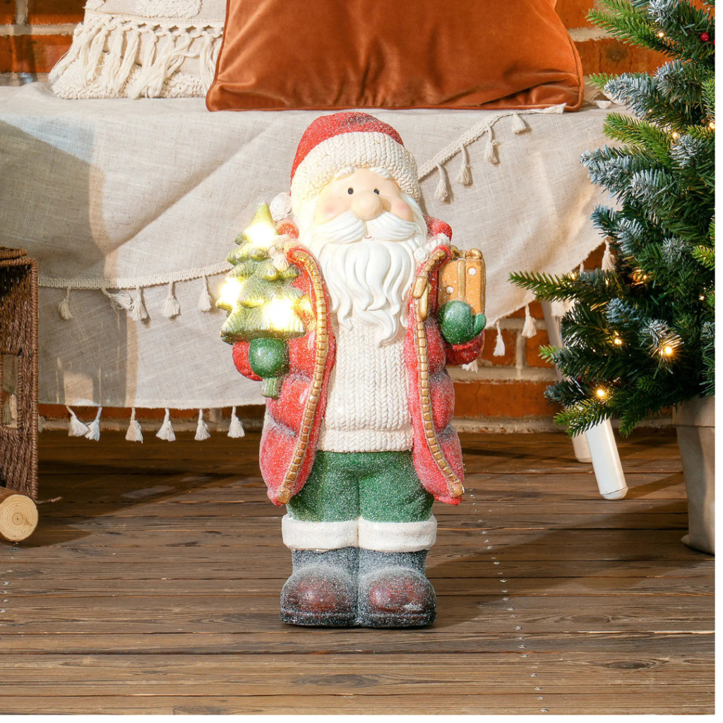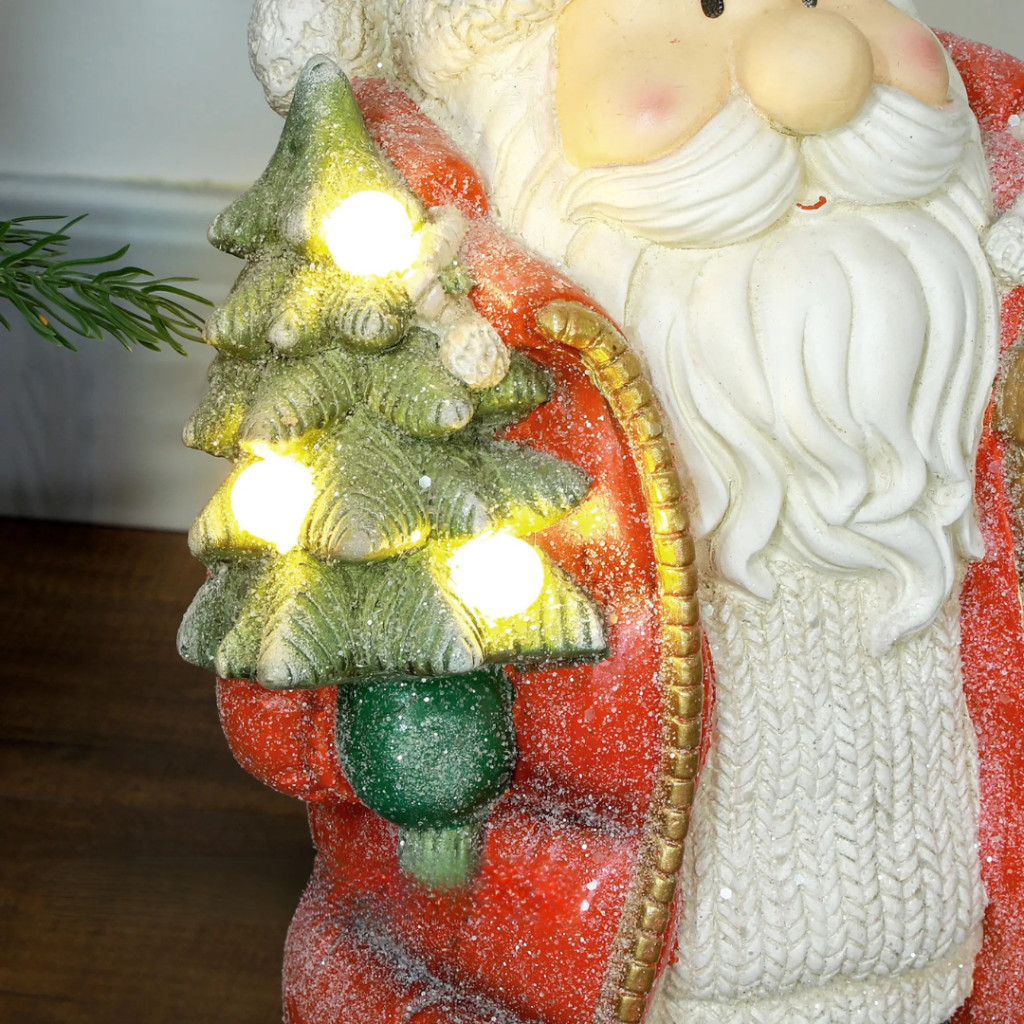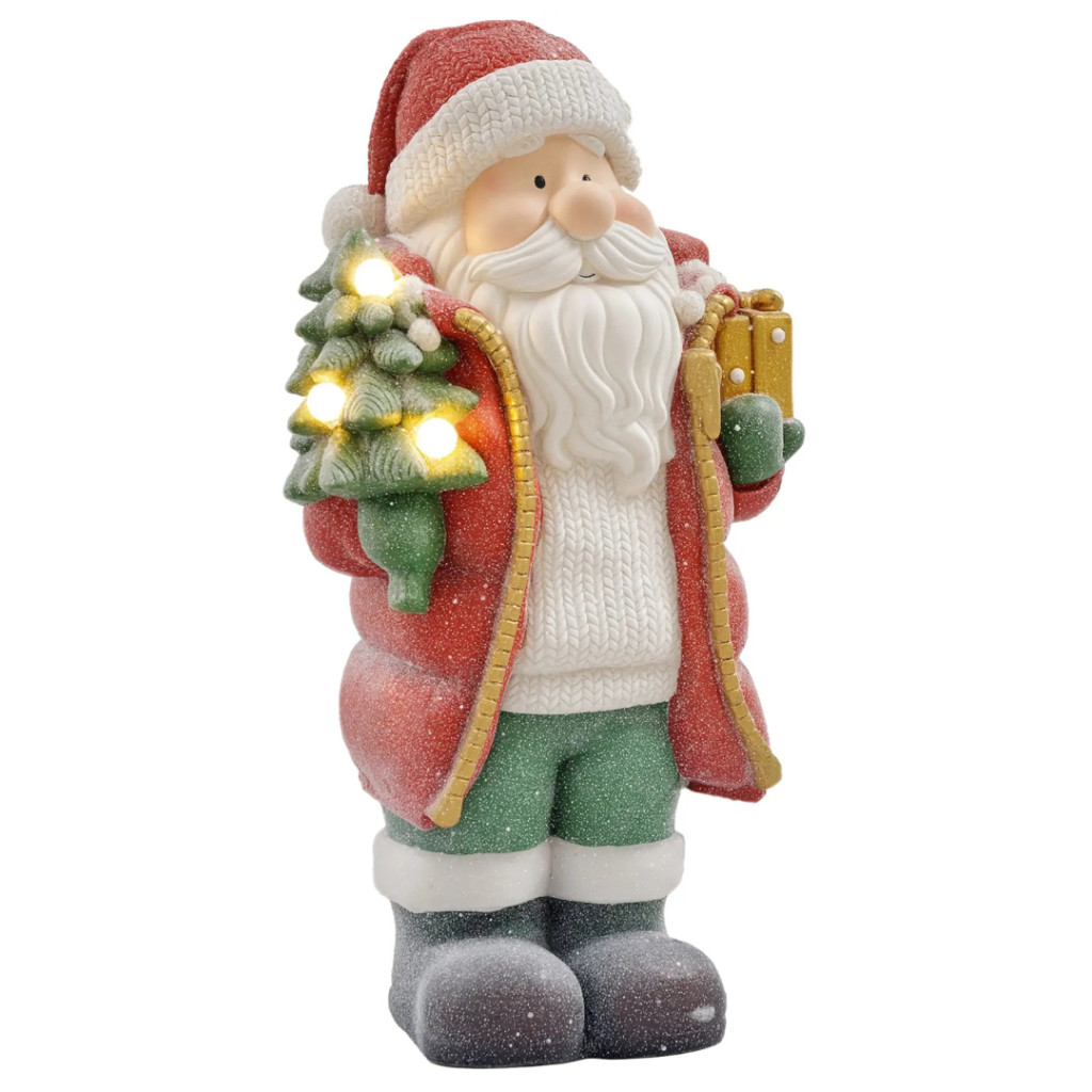 Tegye otthonát még ünnepibbé ezzel a LED-es Mikulás szoborral, amely egy karácsonyfát és ajándékdobozt tart a kezében. A három melegfehér LED-fény kellemes, meghitt ragyogást biztosít, miközben a figura kedves részletei életre keltik a karácsony varázsát. Az elemes működés teljes szabadságot ad a dekoráció elhelyezésében, így bármelyik helyiség tökéletes dísze lehet.
