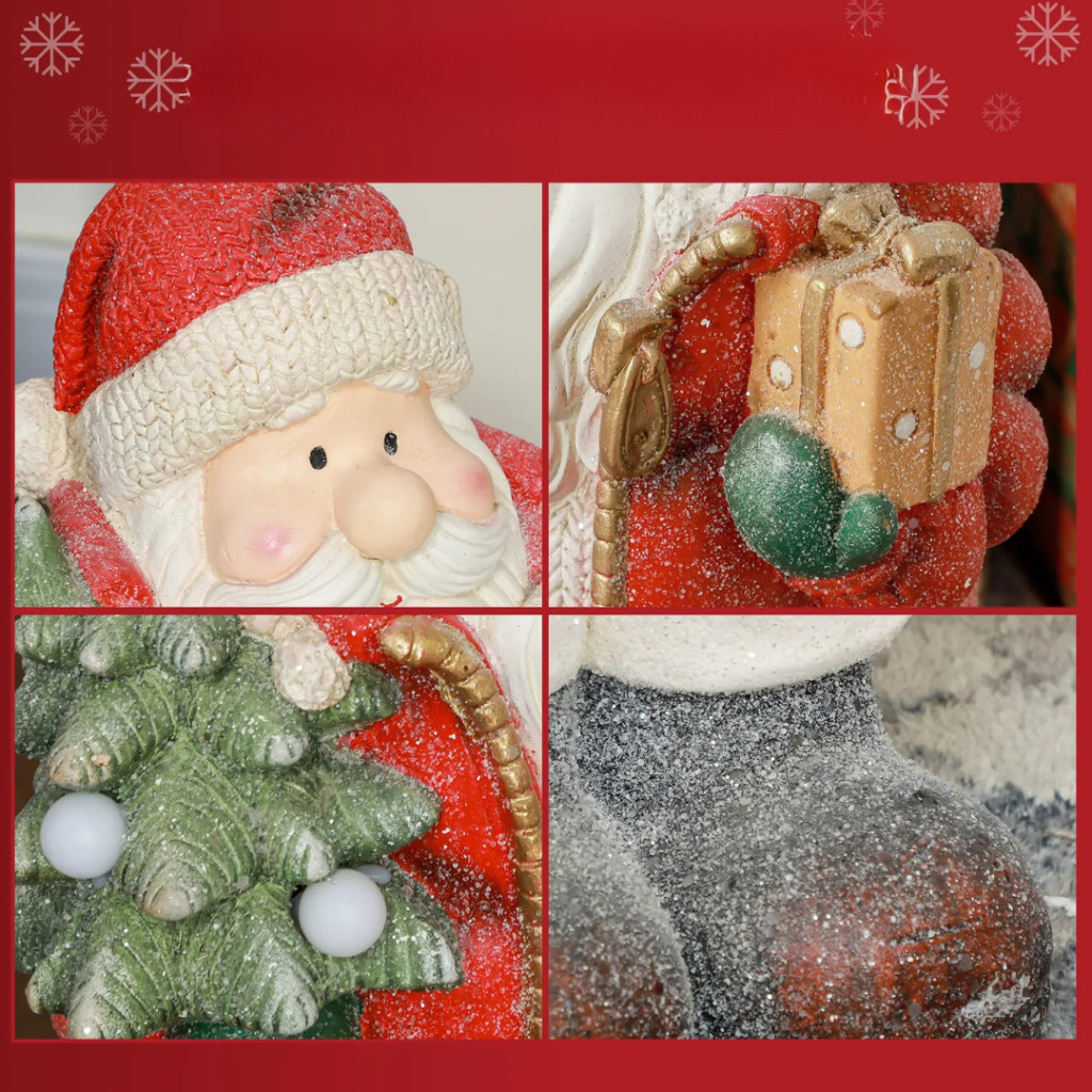 Ez a szeretettel kidolgozott Mikulás-szobor karácsonyfával és ajándékcsomaggal a kezében az ünnepi bőség és öröm szimbóluma. A részletesen megformált ruha, az aranyozott díszítések és a barátságos mosoly meleg, nosztalgikus hangulatot teremt, amely visszahozza a gyermekkori karácsonyok varázsát.