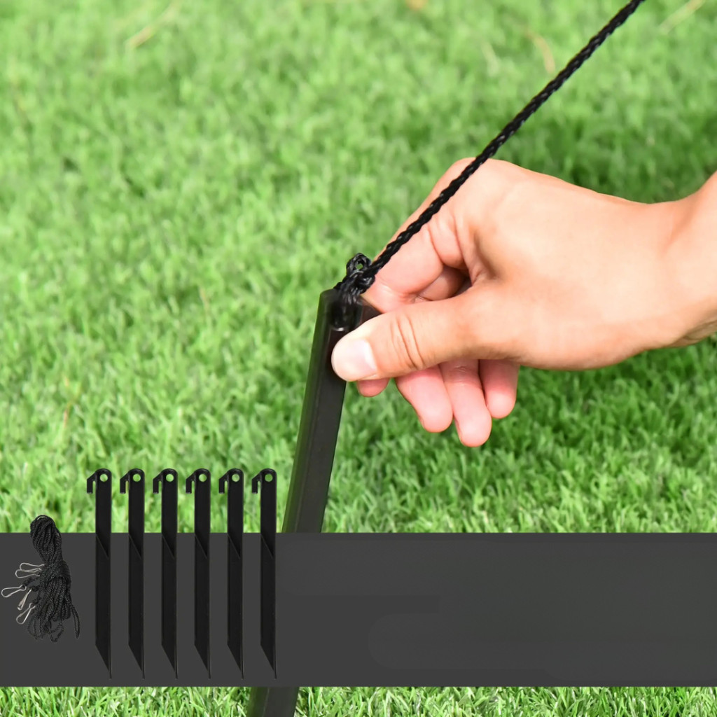 A csomagban található rögzítőkötelek és földhorgony tüskék lehetővé teszik a stabil, biztonságos elhelyezést, még szeles időben is.