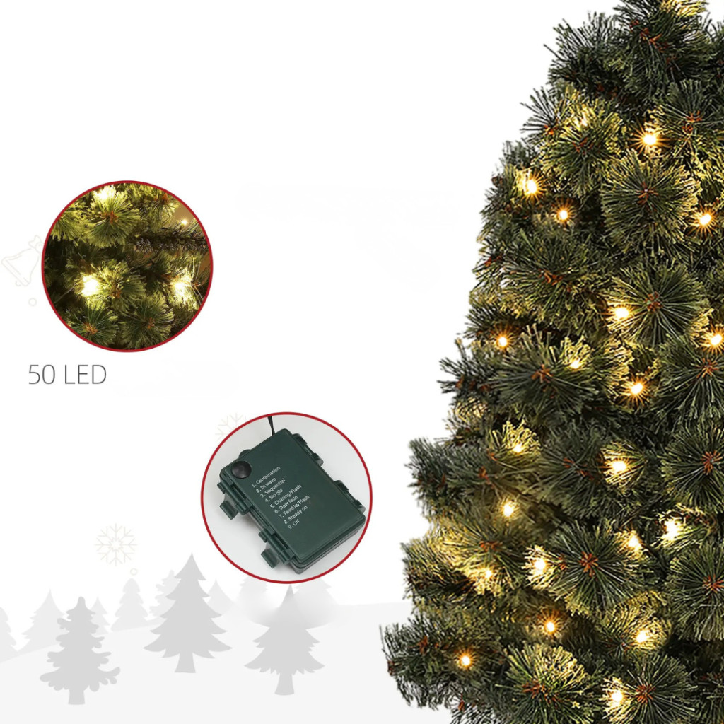 A fa 50 darab melegfehér LED-del rendelkezik, melyek 8 előre beállított világítási módban működnek – a finom villogástól a folyamatos fényig. A fényerő tetszés szerint állítható, így a világítás mindig a hangulatához igazítható. Az időzítő funkció automatikusan szabályozza az üzemidőt, így energiatakarékosan használható.