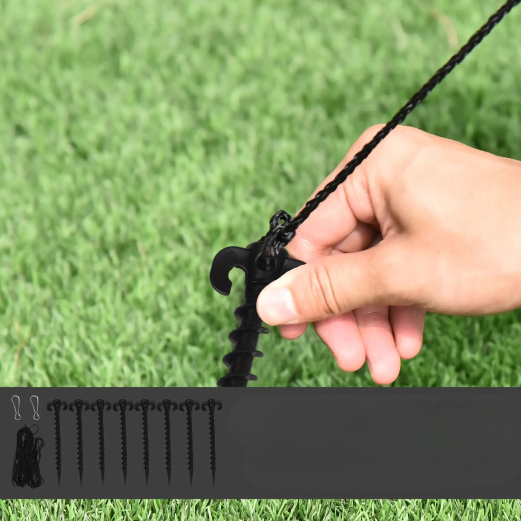 A csomag tartalmaz 8 földhorgony tüskét, 4 rögzítőkötél-t és 3 homokzsákot, amelyek stabil tartást biztosítanak még szeles időben is.