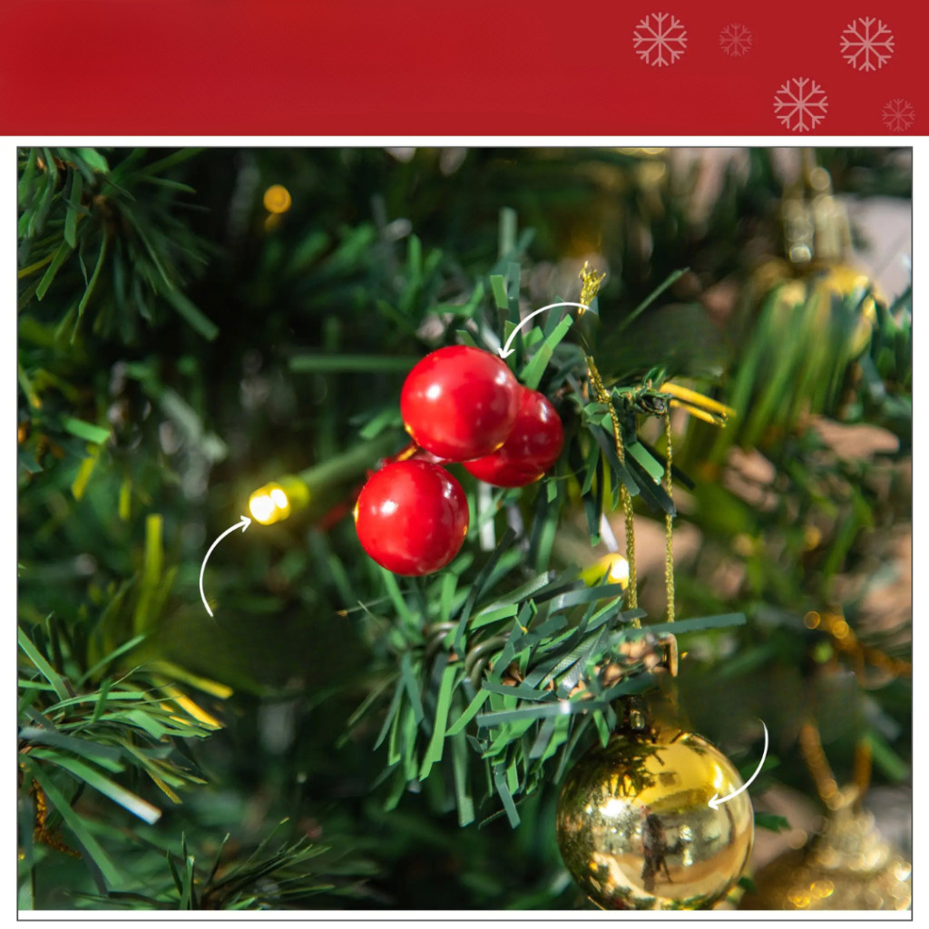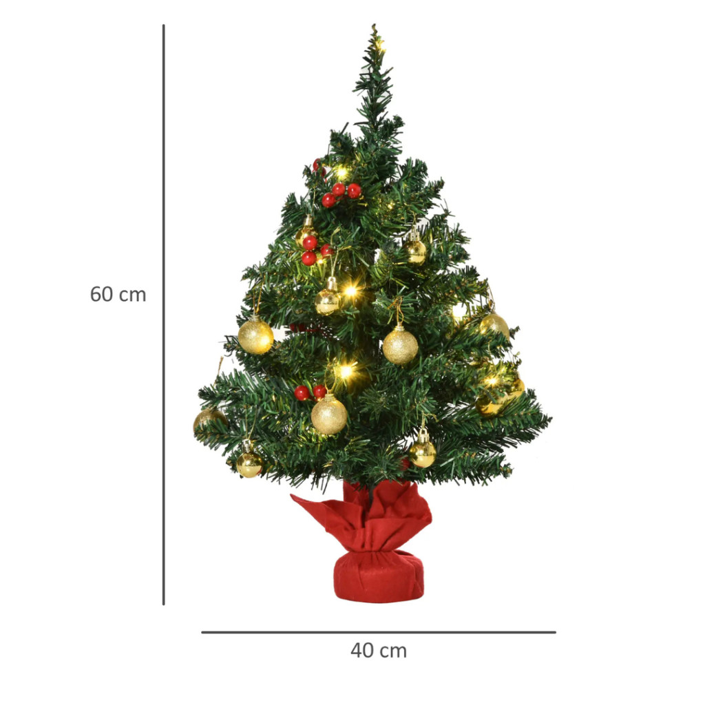 Mini LED-es karácsonyfa 60 cm magas, arany díszekkel, piros bogyókkal és melegfehér fényekkel