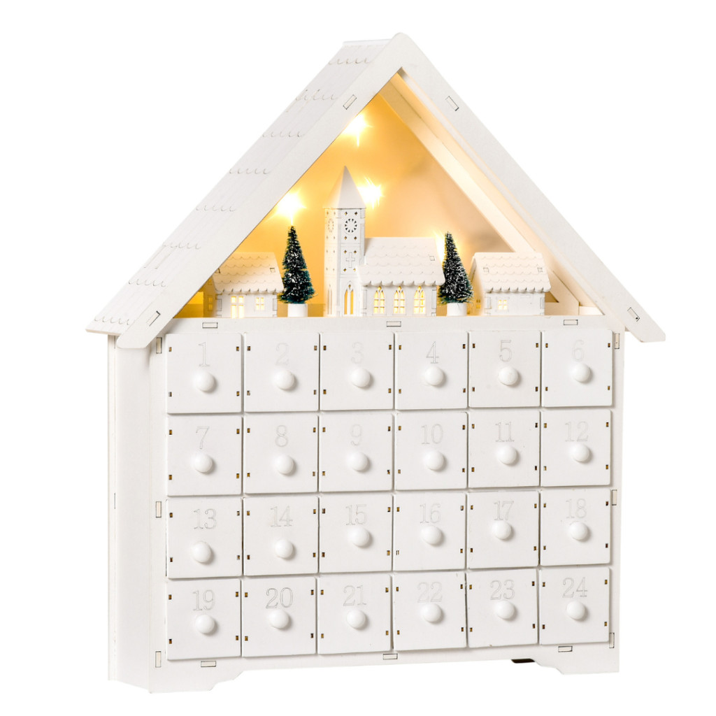 A finoman világító adventi naptár barátságos, otthonos légkört teremt – tökéletes választás komódra, íróasztalra vagy kandallópárkányra.