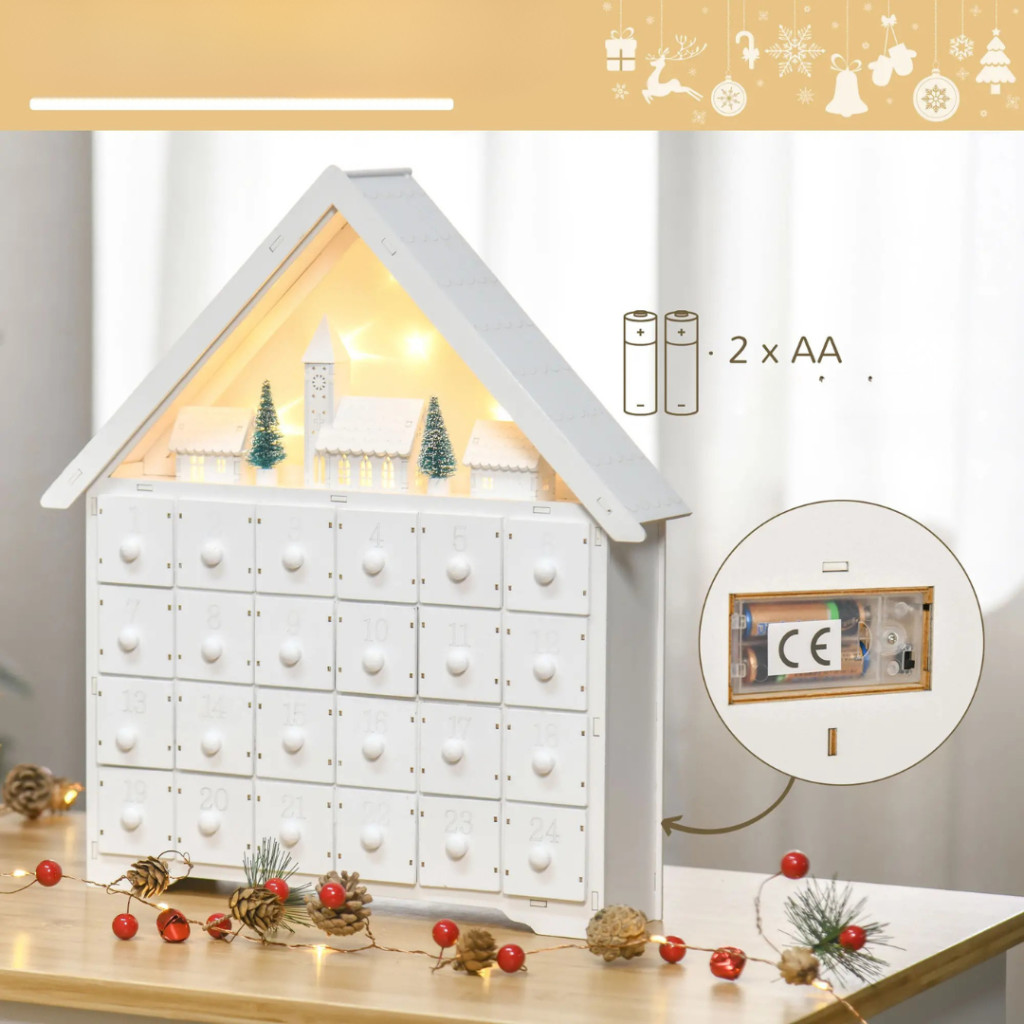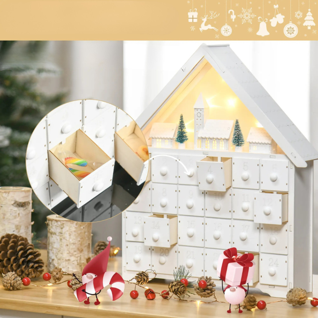 Tegye különlegessé az ünnepi várakozást ezzel a gyönyörű, fából készült adventi naptárral, amelyet beépített LED-fények és klasszikus karácsonyi motívumok díszítenek.